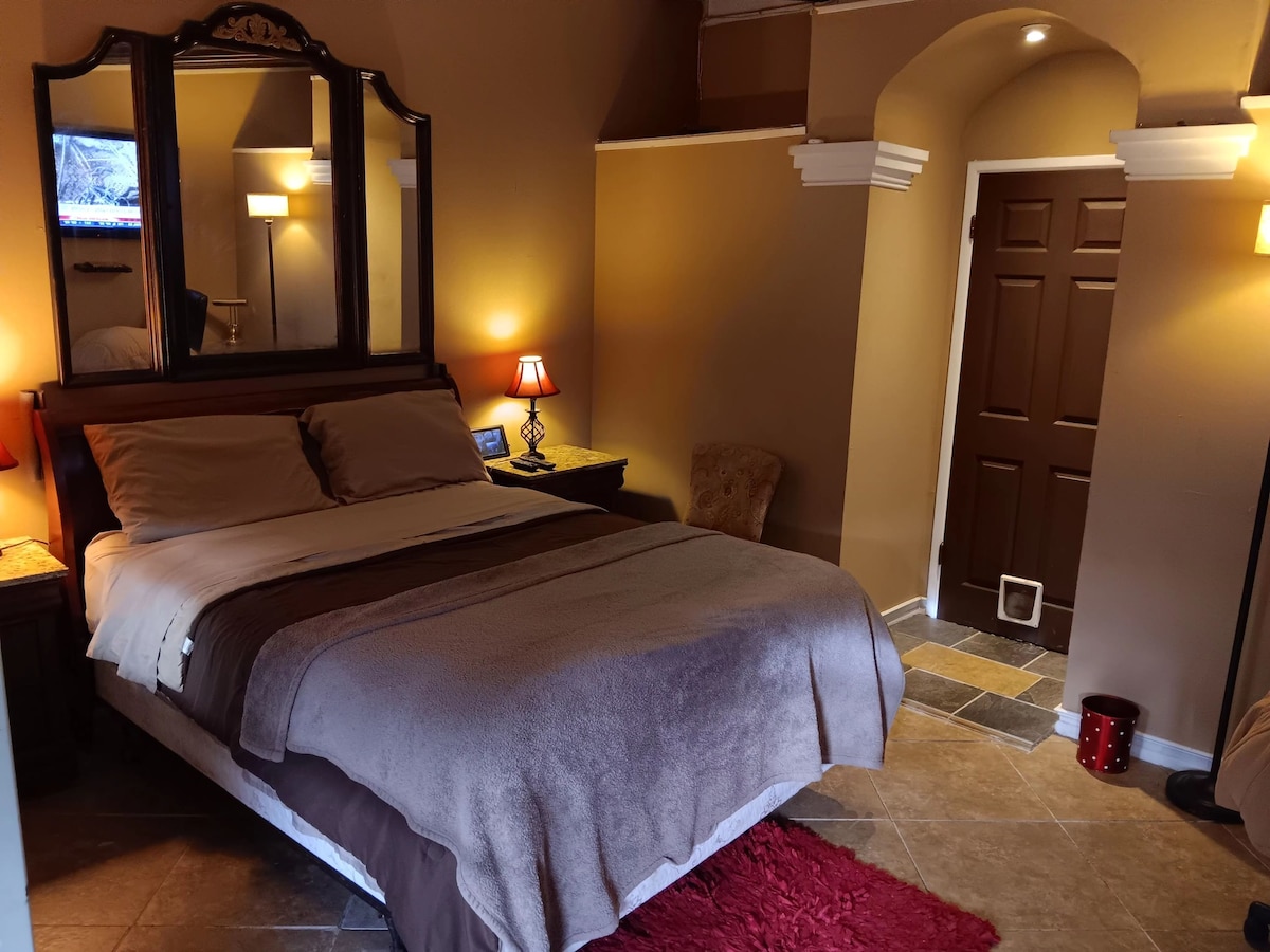 Vacationers, Extended Family, Work Travelers with Fast Internet! ALL the Comforts & Gourmet Kitchen!! Optional 2nd Full Size bed set-up fee - separate bill for 3rd person. Fully stocked gourmet kitchen, full-size appliances; small ones too! Full bathroom: large walk-in shower with 2 shower head fixtures! Bidet & every amenity. Patio, water fountain, Adirondack chairs, bistro table, outdoor shower-enjoy privately. Appointed to provide maximum functionality and relaxation!