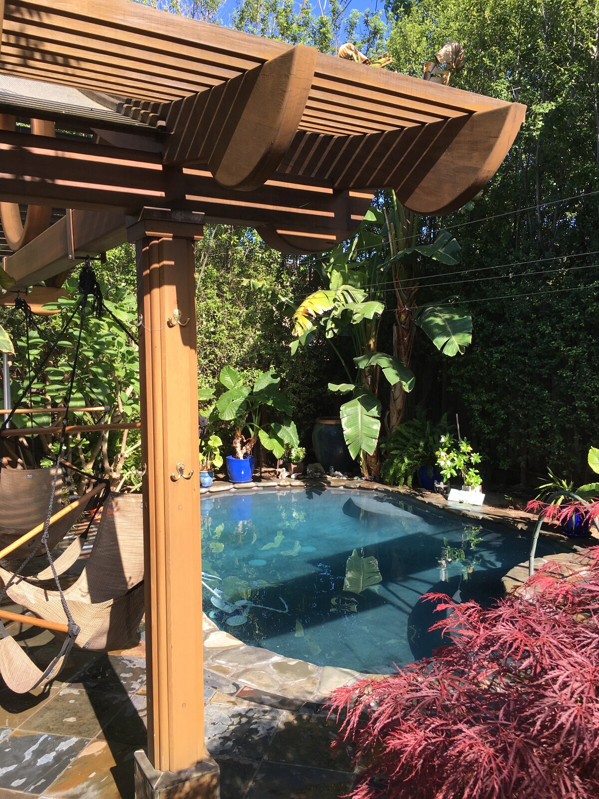Our guests best describe it as: ‘Like luxury hotel meets Zen retreat meets Day Spa meets Bali rain forest meets mom and pop warm hospitality’. A private cabana close to shops and restaurants in downtown Willow Glen. You’ll love our place because of the tranquil setting, warm watsu pool, Finlandia sauna, hot plunge, and beautiful gardens. Our place is good for couples, solo adventurers, and business travelers.