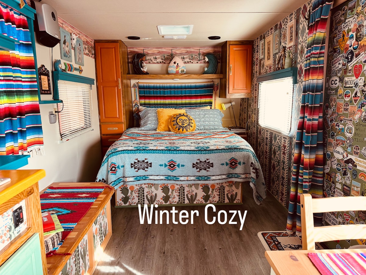 The Broken Arrow Camper is a restored camper. Southwestern Styled. Vintage & Retro. It is nestled amongst beautiful Joshua Trees and a cactus garden on our well maintained property. Reading the full description of our place is important. WE are LGBTQ friendly. No Haters please. **We are located directly off the MAIN road In the old western run down town Dolan Springs which leads to The Grand Canyon West Rim. ***Be aware that on full moon nights the coyotes howl all night.