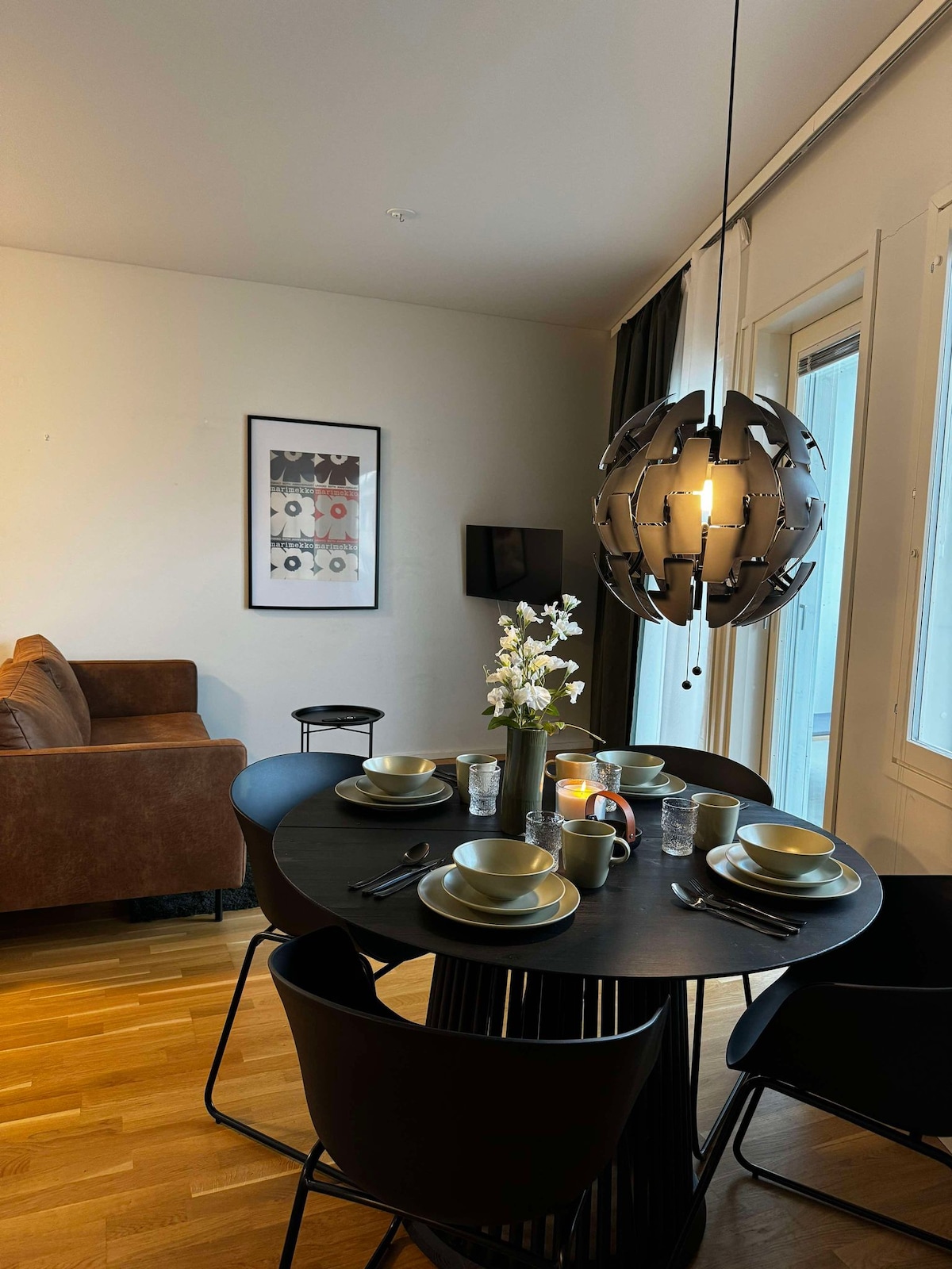 Winter Dream Suite – Luxury and Relaxation Near the City Center This high-quality and spotless apartment accommodates up to four guests and features a private sauna and a cozy balcony. The location is perfect: a peaceful setting ensures restful nights, yet the city center with its services and attractions is just a short walk away. Scandinavian style 2nd floor apartment has a large living room, alcove with queen size bed, sauna and furnished balcony. Fully equipped kitchen.