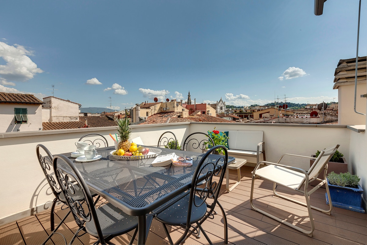 ***LONG TERM RATES AVAILABLE FROM NOW THROUGH MARCH IF INTERESTED *** Sunny studio apartment with a private rooftop terrace and sweeping views over Florence's rooftops, monuments, and surrounding hills. Super location in one of the few remaining authentic Florentine neighbourhoods, central and only a few minutes’ walk from the main monuments and sights, yet above it all, so very peaceful and quiet. A truly unforgettable spot to start your day and dine under the stars in the evening.