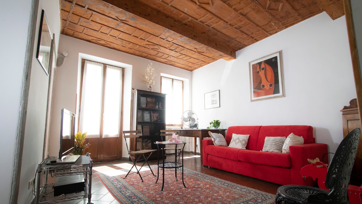 This is a lovely and welcoming apartment with a patio in the center of Florence, 2 + 2 beds, and is newly renovated. It is located on the ground floor (no stairs) of a characteristic building in the district of Santa Croce, in the heart of the historic center. It was renovated by the owner, an architect with twenty years of experience, who wanted to preserve and enhance the features and characteristics typical of an ancient Florentine house: wooden beams, antique portico with stone column and brick arches. It consists of an entrance hall, a living room with dining area and relaxation area, a sofa bed, a sleeping area with a French double bed and separated by curtains, a private courtyard with a fountain, and a bathroom with a shower. The apartment gets great sunlight and is very quiet because it overlooks the private courtyard. It is warm in winter and cool in summer and equipped with every comfort: independent heating, air conditioning, free wifi internet access, books, magazines, tourist guides in Italian, English, French, German, and maps. There is a fully equipped kitchen, including coffee, oil, salt, sugar, and a large selection of teas. Dishwasher and washing machine. Because the apartment is located in the heart of Florence where only Florentine residents are permitted to park, it is necessary to leave your car in one of the parking garages near the apartment (fee €. 20-25/day). You can easily walk to every place of artistic and cultural interest. If you arrive by train, you can walk or reach me directly by bus. If you arrive by plane you can take a taxi directly to my front door. This district is the most charming of the city and the street is quiet and peaceful. I will be glad to welcome you personally: check-in and check-out every day of the week at a time to be agreed upon at booking.