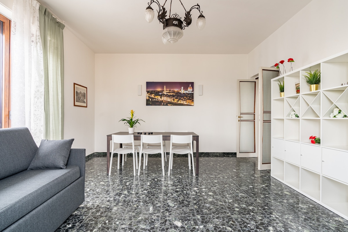 Donatello Apartment is very large (120 sqm) located on the ground floor and is suitable for any type of family or group of friends. It is 5 minutes walk from Campo di Marte station and 10 minutes from the center of Florence. Parking in the area. Composed of entrance, equipped kitchen, dining room, bathroom with shower, bedroom with double bed and TV, living room with double sofa bed and TV, bedroom with single bed, equipped garden. Free Wifi throughout the apartment.