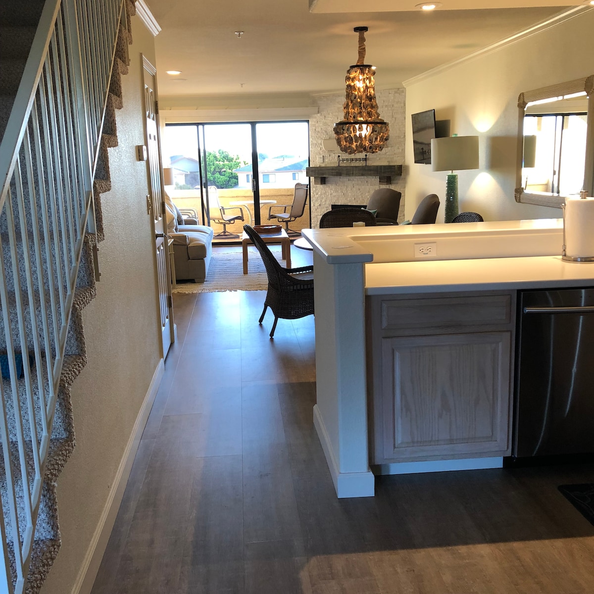 Our beautifully renovated 2 bedroom (Both upstairs) and 2 full bathrooms (One on the ground floor and one on the upper floor) along with a ground floor plush queen sleeper sofa and ground floor great room with dining for 7 plus a bar table separating the kitchen from the living room is in the perfect location. Walk to the beach, shops, restaurants, or a nice walk along the river. We are right in the Capitola Village. We hope you enjoy your stay. If you have questions, we respond promptly.