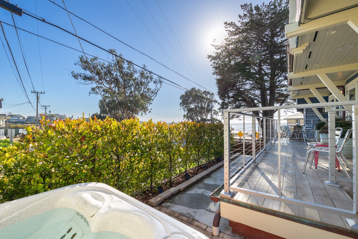 Permit# 231467 Incredible modern home just steps from the best beach in all of Santa Cruz! Ocean and sand views, listen to the waves as you sleep on designer beds, cook in the chefs kitchen, and soak in the hot tub. Perfect central location, less than 5 minutes to boardwalk and downtown. 5 minutes to colorful Capitola village. 9 minutes to UC Santa Cruz Campus. 4 Electric bikes, 4 surfboards, and a kayak to take out and play in the waves! Plus the beach is right out front to enjoy!