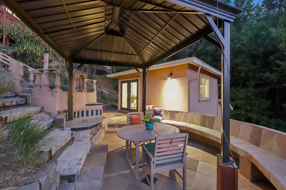 Enjoy a high-touch, yet private casita near UCSC. Curl up with a book in your red leather armchair in the beautiful living room featuring down, Restoration Hardware furnishings and a gas burning fireplace. In the evening, take a seat on your private patio beneath a leafy pergola and enjoy a glass of wine at this historic, Spanish-style casita. Some of the BEST bakeries, natural grocery stores, wine tasting, shopping, beaches and restaurants are all a short walk/bike ride or drive away xx