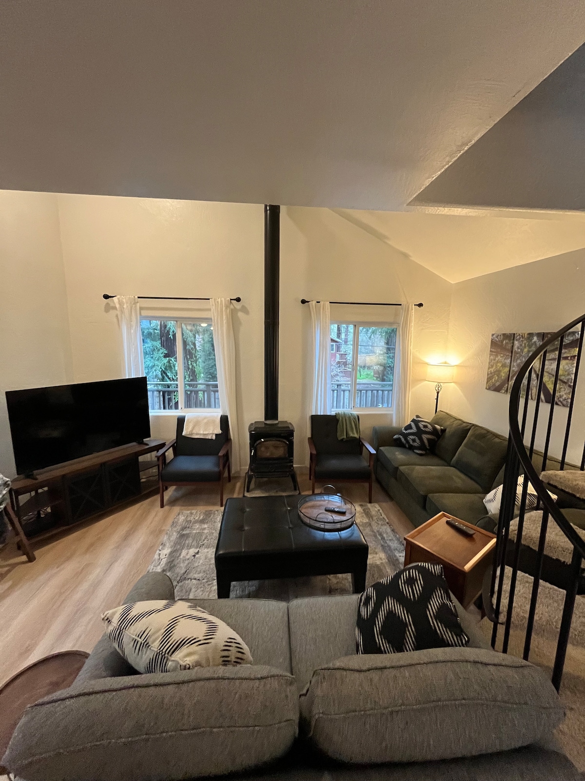 Permit number 231040 Private cabin in a serene, wooded setting, 20 min. to Santa Cruz. Main house has two bedrooms and a loft. Hot tub, outdoor shower, outdoor kitchen, gas barbecue, large deck, views. Indoors has a modern, well-equipped kitchen, great room, gas fireplace, loft, master bedroom, guest bedroom, two bathrooms. I am not longer allowed to rent out the two ADUs. Quality furniture, comfortable beds, stylish sectional, large dining table.