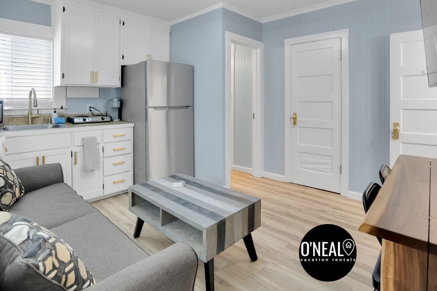 Private small cozy 1 br/1ba bungalow. This space boasts a taste of Latin American beach, Spanish tile floors and wood furniture. Kitchenette with an induction burner and xl toaster oven (no range) , full size fridge, private patio seating, umbrella, tropical plants. Bathroom with a small shower. Curtained off bedroom with full closet, queen bed. Living room has day bed/couch with twin mattress for 3rd guest. Plz read “other details to note” before booking.
