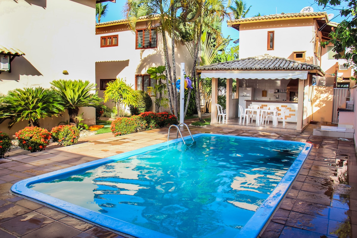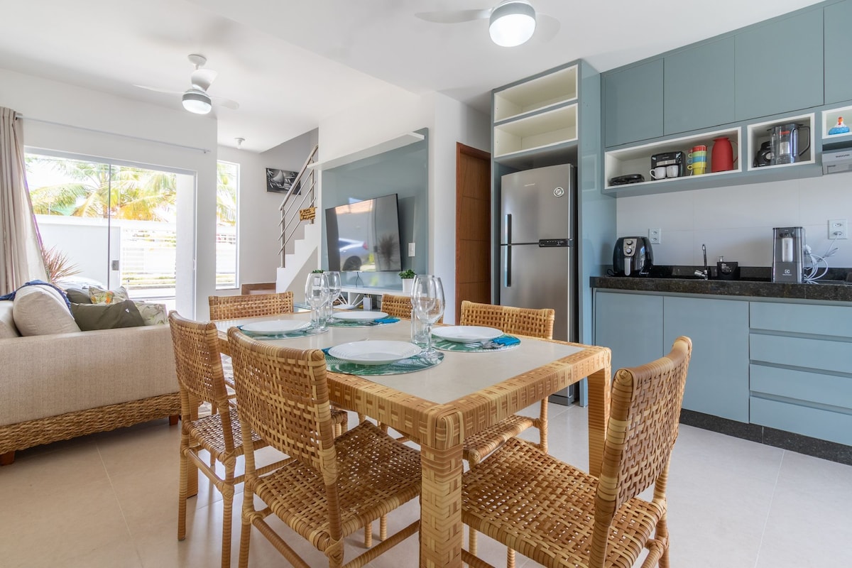 Lazer, conforto e tranquilidade em Porto Seguro! Duplex novo na orla de Taperapuan, a 150 metros da praia. A rua possui mercados, restaurantes, lanchonetes e lavanderia. São 3 quartos com ar-condicionado, 3 banheiros, sala, cozinha, área de serviço, Wi-Fi e acomoda até 9 pessoas em camas confortáveis. Condomínio com 7 unidades, piscina e área gourmet compartilhadas. Cada duplex conta com 2 vagas de estacionamento.