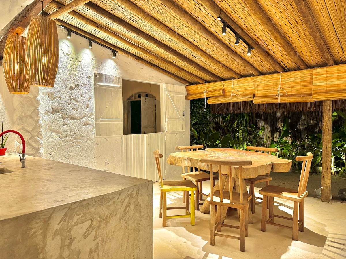 Uma acomodação aconchegante com um jardim amplo, repleto de plantas diversas. Pela manhã os hóspedes são despertados pelo canto dos pássaros. Uma piscina convidativa, ideal para um mergulho refrescante. O local esta próximo ao mar, facilitando o acesso a praia. Na varanda a rede esta disponível para um descanso em um ambiente tranquilo e confortável.