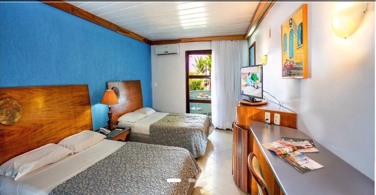 Quarto dentro do Portobello Park Hotel administrado pela JL Temporadas, com área de lazer que compõe: Recreação Toboágua infantil e adulto Campo de Futebol Quadras 3 Piscinas salão de jogos e muito mais.... Café da manhã é a parte e pode ser solicitado no momento do checkin. Ficamos a menos de 400 m da praia de Taperapuan e da Barraca Axé Mói, além de bares e restaurantes a pouco metros e de dois mercados na região