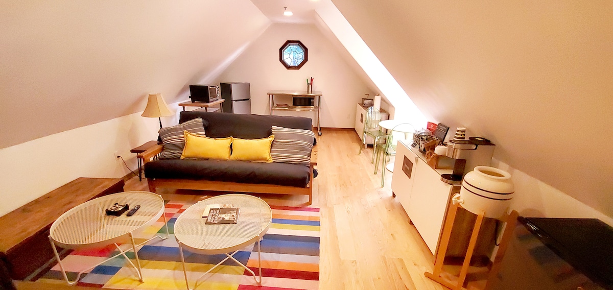 One-bedroom attached in-law suite with private entrance- relaxing den with large leather couch, flat screen tv (Roku/no cable) kitchenette w/hot plate and private bath. Mountain location 2.5 miles down a very narrow scenic ridge-top road attached to our primary residence on 6 beautiful acres of lush vegetation and towering redwood trees. Ideal for a couple or small family looking to explore the Santa Cruz county Mountains, Bay Area and coast without breaking the bank.