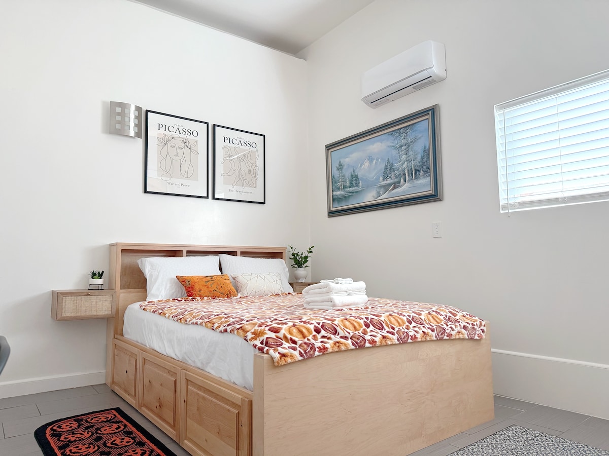 Private small cozy 1 br/1ba bungalow. This space boasts a taste of Latin American beach, Spanish tile floors and wood furniture. Kitchenette with an induction burner and xl toaster oven (no range) , full size fridge, private patio seating, umbrella, tropical plants. Bathroom with a small shower. Curtained off bedroom with full closet, queen bed. Living room has day bed/couch with twin mattress for 3rd guest. Plz read “other details to note” before booking.