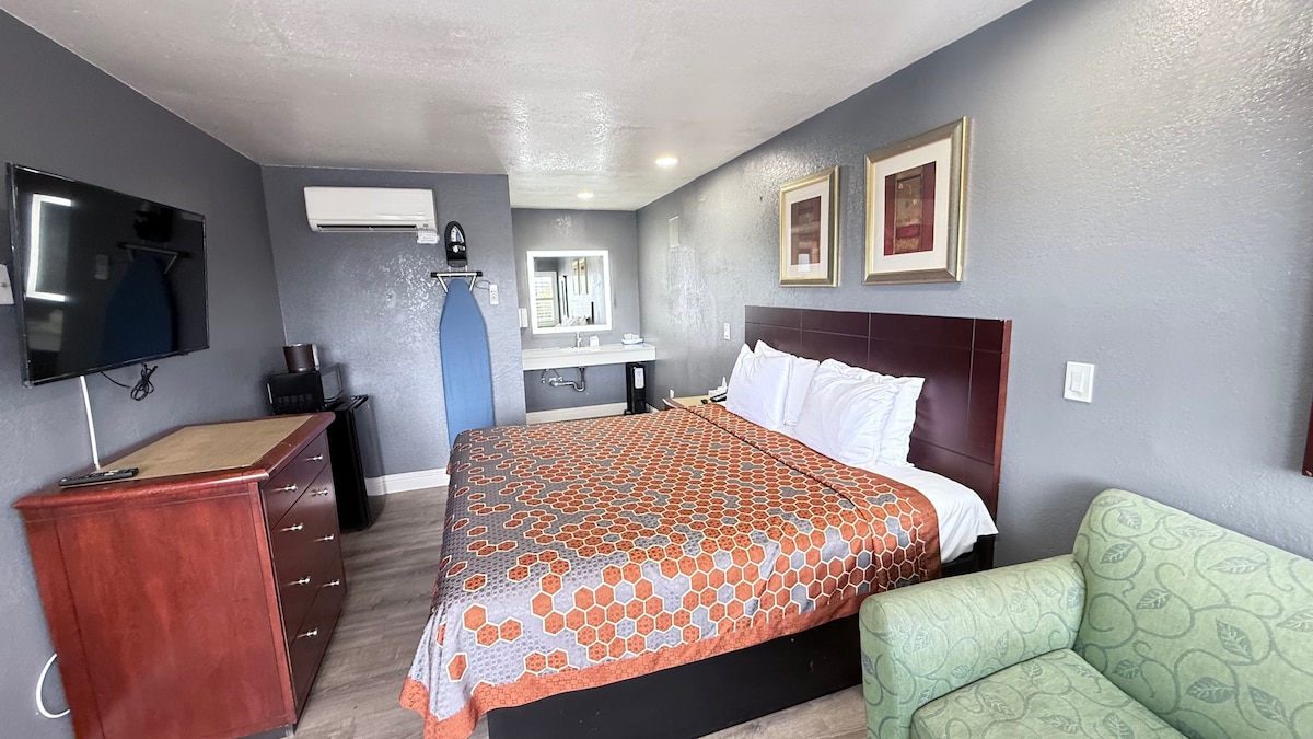 The Standard King Offers Also included are complimentary WIFI, a Refrigerator and Microwave, Coffee Maker, and an iron and ironing board, and blackout drapes. The private bathroom is complete with a hairdryer, and complimentary toiletries. Complimentary parking, electronic key-cards, and wake-up call service are also included.