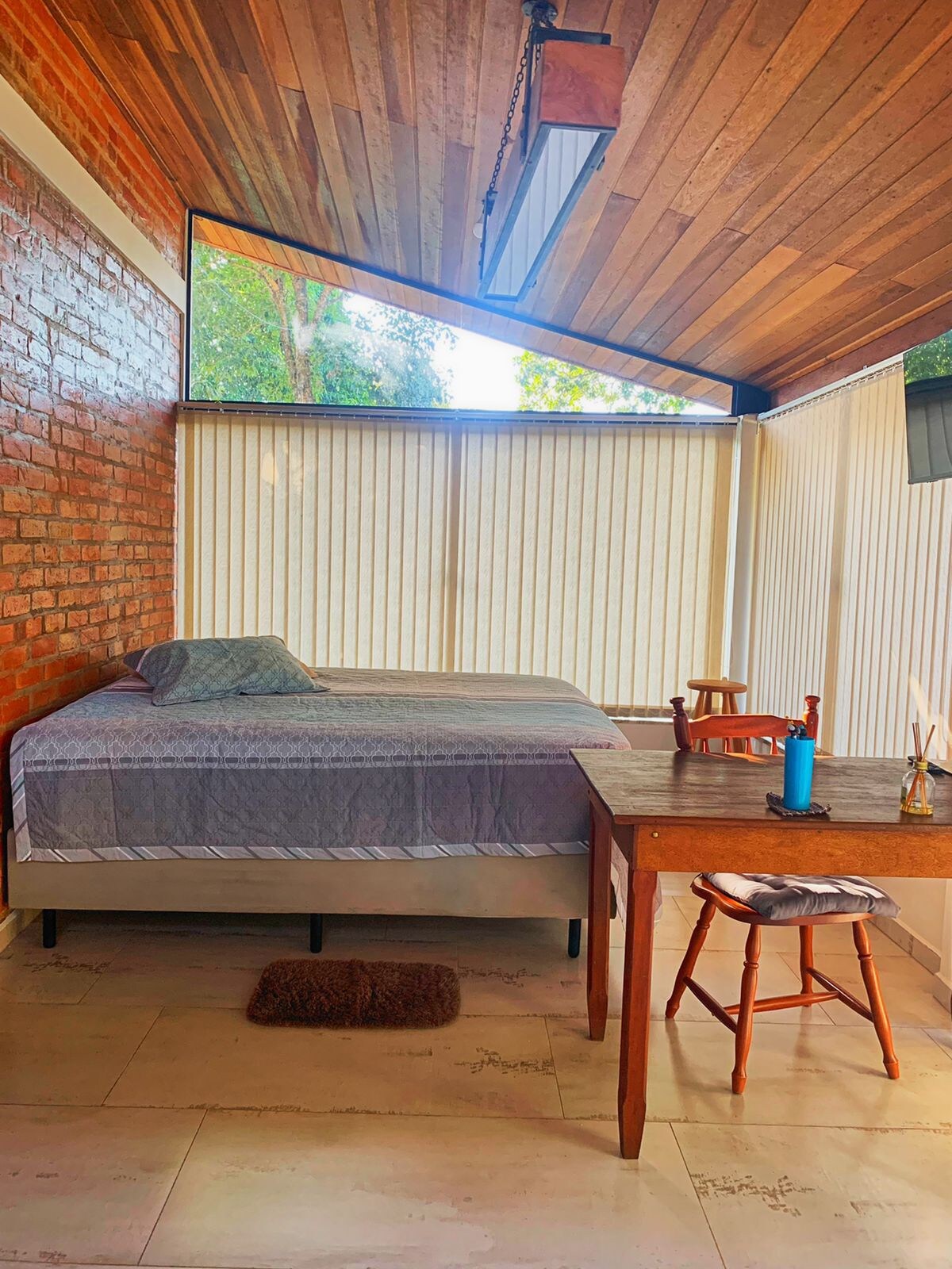 Our stylish accommodation is perfect for short to long stays, with an L-shaped desk, frigobar and WiFi. It has air conditioning of 22,000 BTUs, Super King Orthopur bed + additional single bed, porcelain finish, and Smart TV with Netflix support. The bathroom is spacious and modern, for the exclusive use of the guest. There is ample outdoor space, where you can use the kitchen, which is shared with the hosts. The neighborhood is safe in an upscale area, close to the Jaú Serve Market.