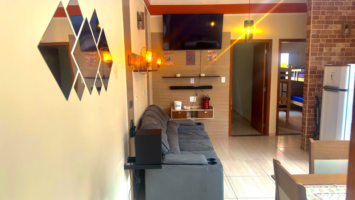 Our stylish accommodation is perfect for short to long stays, with an L-shaped desk, frigobar and WiFi. It has air conditioning of 22,000 BTUs, Super King Orthopur bed + additional single bed, porcelain finish, and Smart TV with Netflix support. The bathroom is spacious and modern, for the exclusive use of the guest. There is ample outdoor space, where you can use the kitchen, which is shared with the hosts. The neighborhood is safe in an upscale area, close to the Jaú Serve Market.