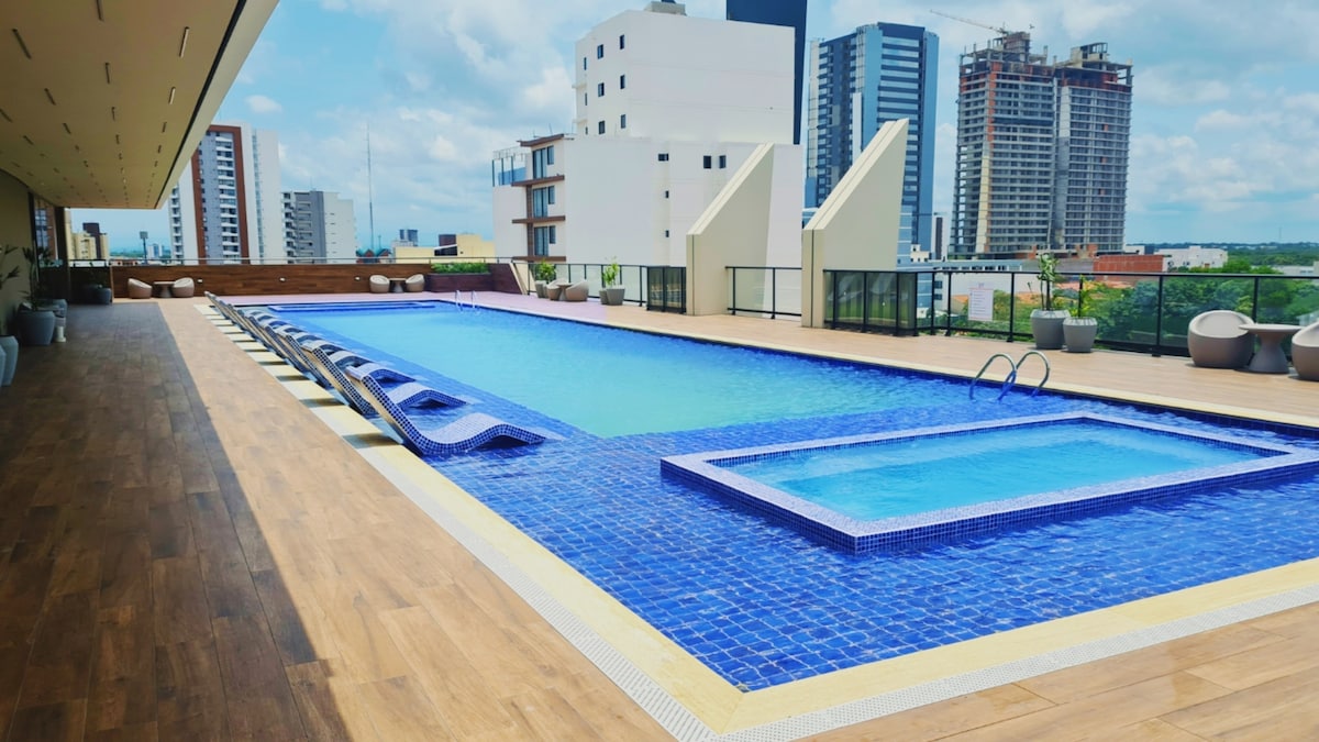 Luxurious 1 bedroom apartment in the best and safest neighborhood in Santa Cruz de la Sierra, close to important points in the city. This 50 m2 apartment welcomes 4 people. What this apartment in the 5th floor offers: - Living room with 50” TV - 1 Bedroom with a queen size bed - Full supplied kitchen - 1 Bathroom - Sofa bed for 2 - Wifi - Cleaning supplies - Coffee, sugar, salt, tea, oil and vinegar - Own parking lot The building offers: - Rooftop pool - Game room - Cinema - Grill - Gym