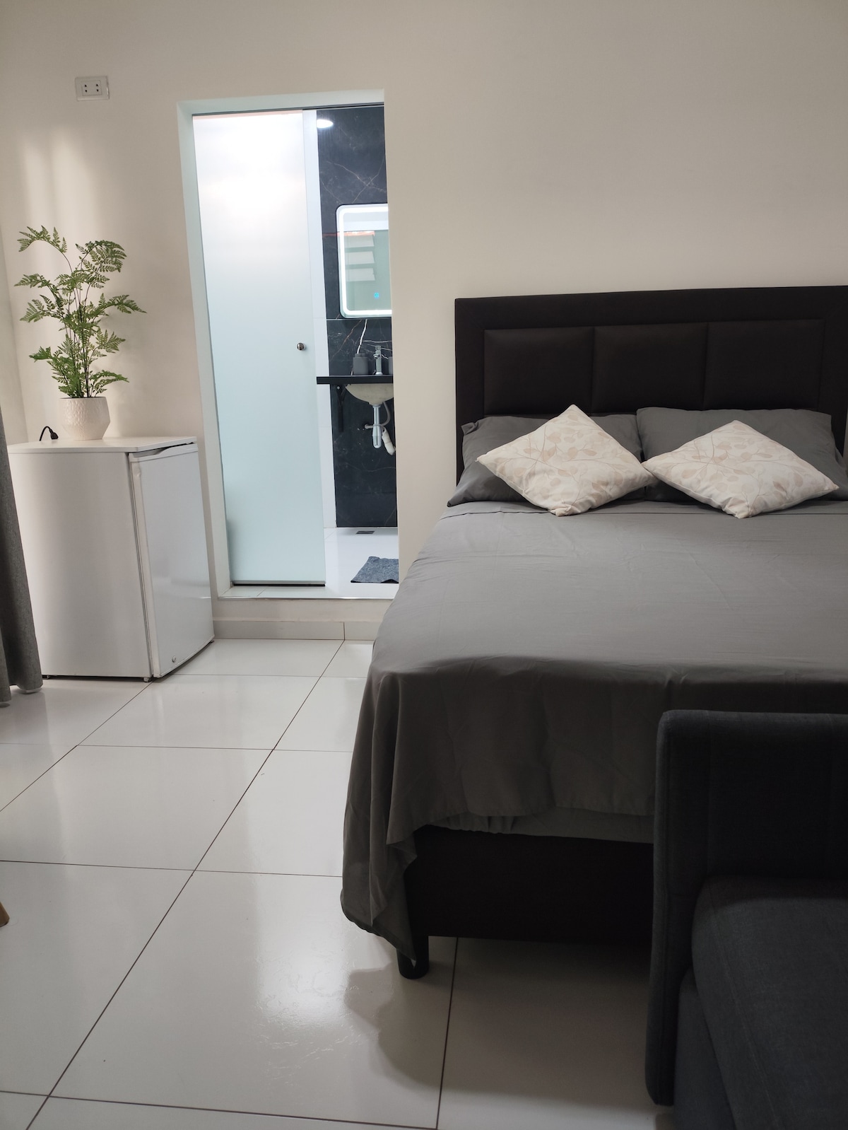 Disfruta de una habitación privada y confortable en una ubicación estratégica y segura a solo media cuadra de una avenida principal, a pasos de centros comerciales, supermercados, mercados y bancos, lo que te garantiza comodidad y fácil acceso a todo lo que necesitas. Contarás con cama queen de 2 plazas ideal si vienes con tu pareja, Smart TV, Wi fi, baño privado con calefón, una sala con un sofá cama, frigobar y una mesita para merendar. ¡Perfecta para pasar unos días en Santa Cruz!