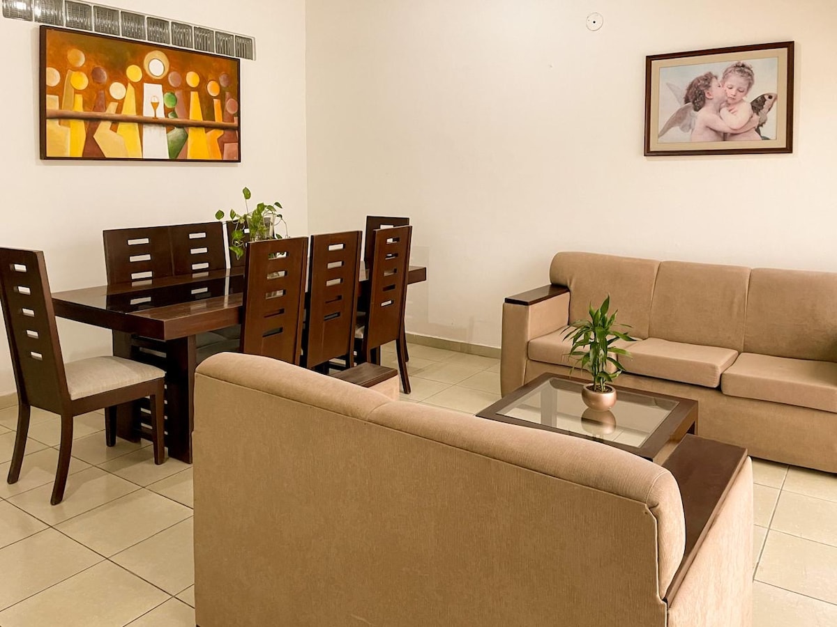 Encantadora casa de 2 dormitorios, equipada y decorada con estilo atemporal. Ubicada en un condominio tranquilo y ultra seguro, a solo 10 min del Aeropuerto Viru Viru y 30 min del centro. Disfruta de las comodidades del condominio: Piscina con toboganes Supermercado y ATM a pocos pasos Gimnasio, saunas y jacuzzi para relajarte Circuitos para caminar y canchas de tenis y fútbol para mantenerse activo. Ideal para: Relajarte lejos del bullicio Una parada tras un vuelo Familias y grupos de amigos.
