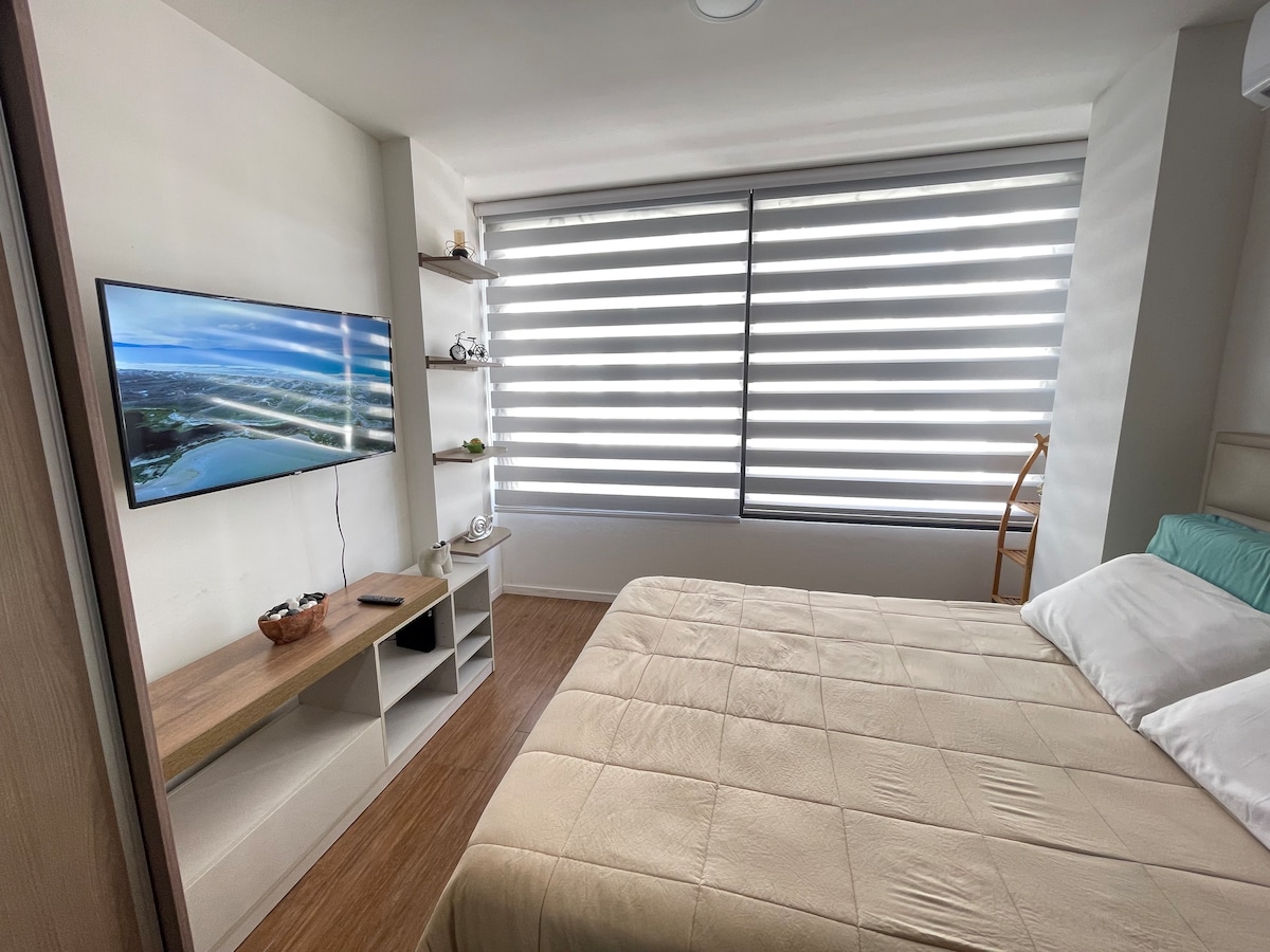 Departamento Monoambiente acogedor en Equipetrol, con todas la comodidades necesarias para pasar una buena estadía (Cama 2 ½ plaza, amplio ropero, tv 49” curvo con Netfilx, WiFi, Sofa Cama, escritorio, cocina equipada, aire acondicionado, baño equipado, balcón con espectacular vista de la ciudad). Áreas Sociales: piscina, área de CoWork, churrasqueras, lavandería, área de recreación.
