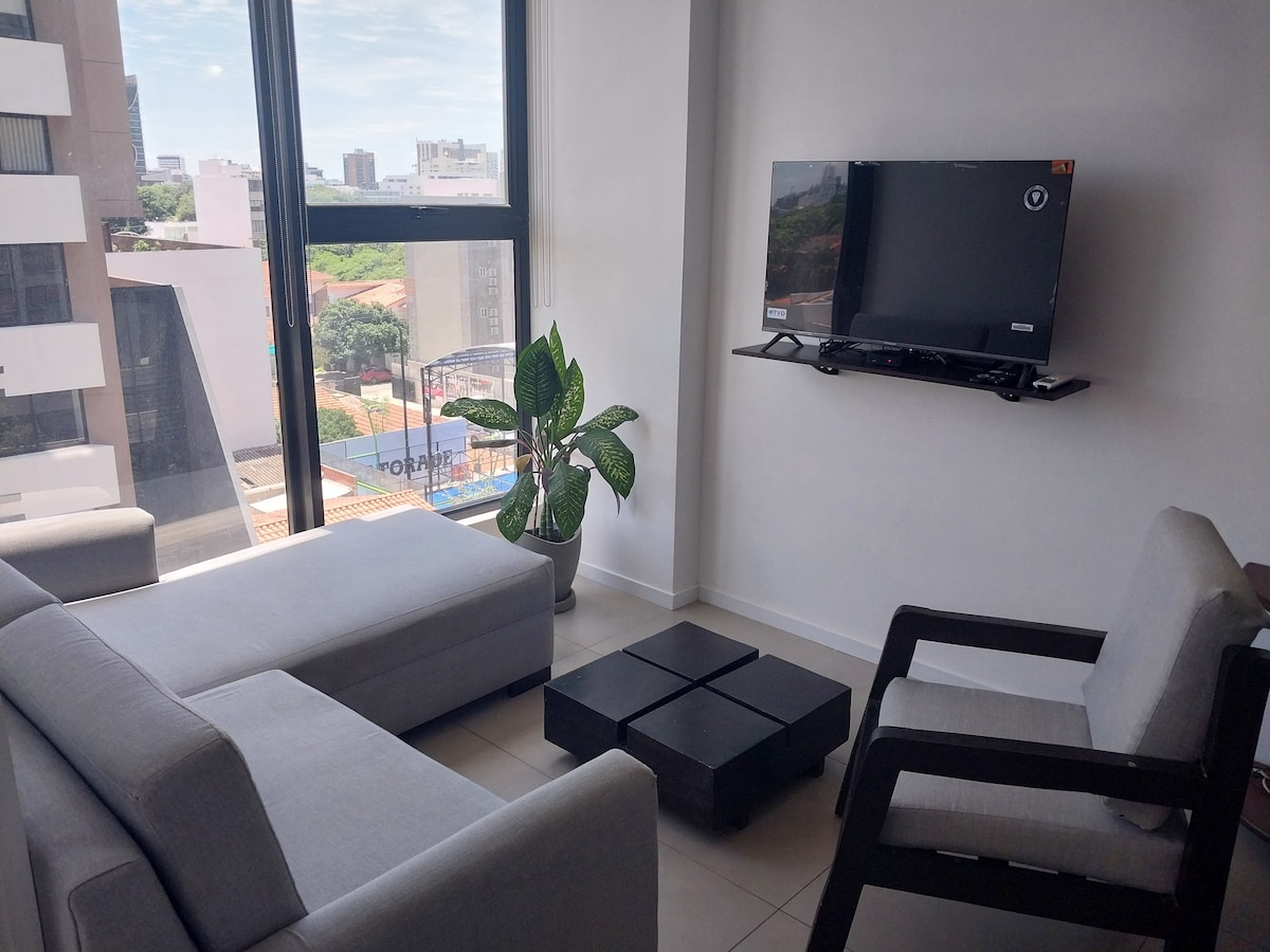 Nuestro Dpto. está ubicado estratégicamente en una de las mejores zonas de la ciudad. Cuenta con 1 cama matrimonial de 2 plz y media y 1 sofá cama en la sala de estar, que puede utilizar una 3era persona. Este departamento está diseñado para que tus amigos o familia puedan disfrutar de una cómoda y agradable estadía. Estamos ubicados en la mejor zona de la ciudad equipado para que te sientas como en casa tiene wifi con alta velocidad, la cocina está equipada con todo lo que puedas necesitar
