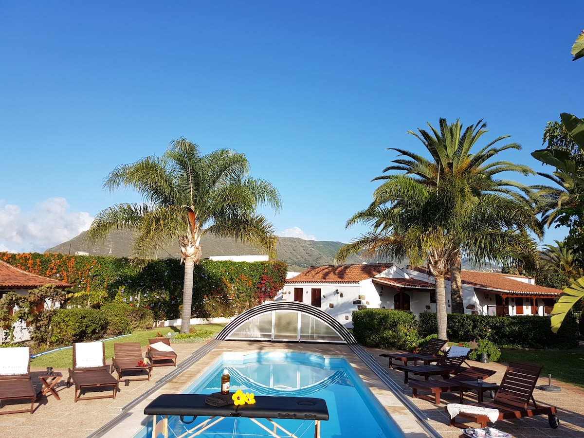 Alojamientos de aspecto rústico que puede alojar hasta 4 personas (+ 1 niño), localizados entre zonas de cultivo del plátano en plena naturaleza con muchos espacios exteriores y de fácil acceso desde los cuales podrá iniciar numerosas rutas de senderismo. Vistas espectaculares donde reina el silencio, la tranquilidad y el canto de los pájaros