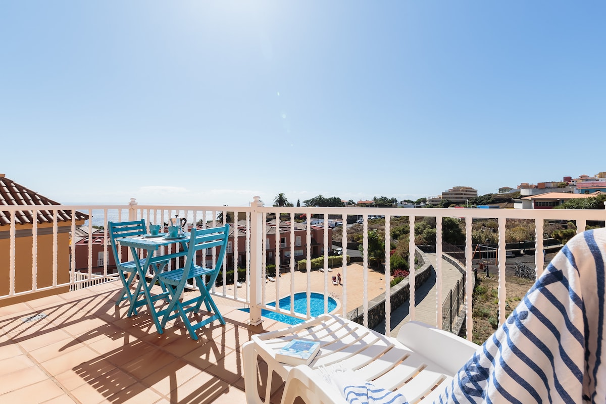 Welcome to our fully refurbished studio with an impressive ocean view, close to beautiful beaches and surf spots. Equipped with fast Wifi, smart TV, fully supplied kitchen, wonderful shower, washing machine and all comforts. Guests have free access to the swimming pool. The bus and taxi station is right in front of the studio. There are supermarkets and shops in front of the studio. Just 5 minutes walk from Playa de las Américas, 8 from Playa de Troya. 15km from the airport.