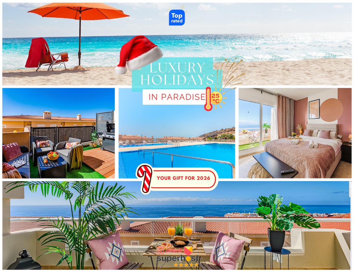 New Penthouse overlooking the sea and the Teide, with private terrace where sunbathing and dining. Fully equipped with warm decoration. Room with a king size bed, sofa with bed of 140 by 185 cm. Covered parking space with elevator to the attic floor. 800 meters from the beach, natural pools and coastal restaurants. Vacational number register A-38/4.3315