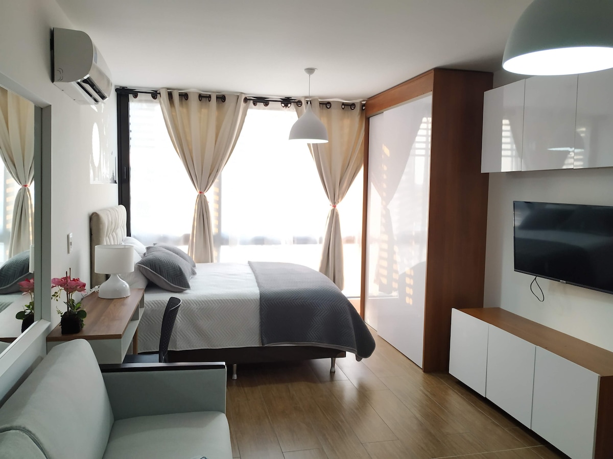 We offer you a comfortable stady with everything you may need, in this modern and new place with our top quality service. This place is fully furnished and has a beautiful view. Is located in the best area from Santa Cruz, and also near of fancy restaurants, malls and business area. You can have access to building's social areas like: co-work zone, pool, steakhouse and laundry. (pics)