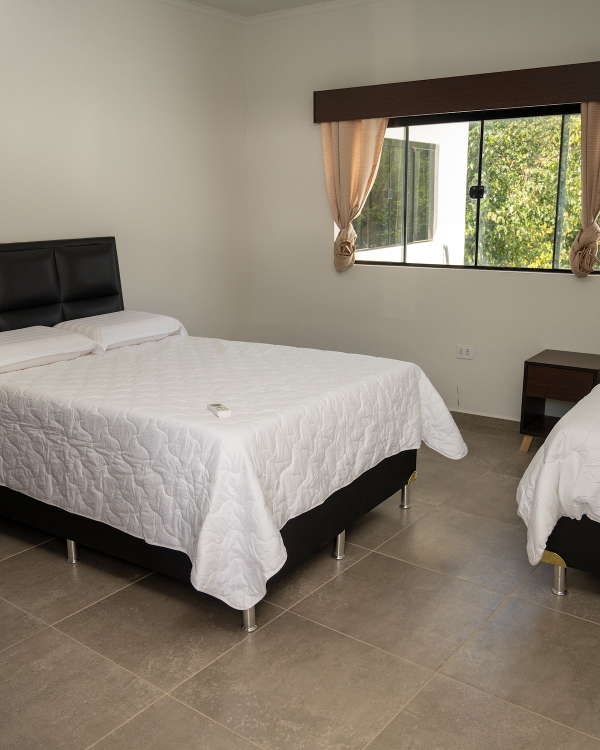 Habitación triple de categoría Ejecutiva. Ubicada en planta alta, con vista al jardín y acceso desde el edificio principal a galerías. En una amplia habitación con una cama matrimonial y una individual. Está decorada al estilo de los habitantes de la región cruceña, por eso se llama Camba. Equipada: -Aire Acondicionado -TV -WIFI -Frigobar -Productos de higiene -Limpieza diaria -Desayuno incluido La Villa Chiquitana es un amplio entorno de relax y confort para vivir la esencia de la Chiquitania.