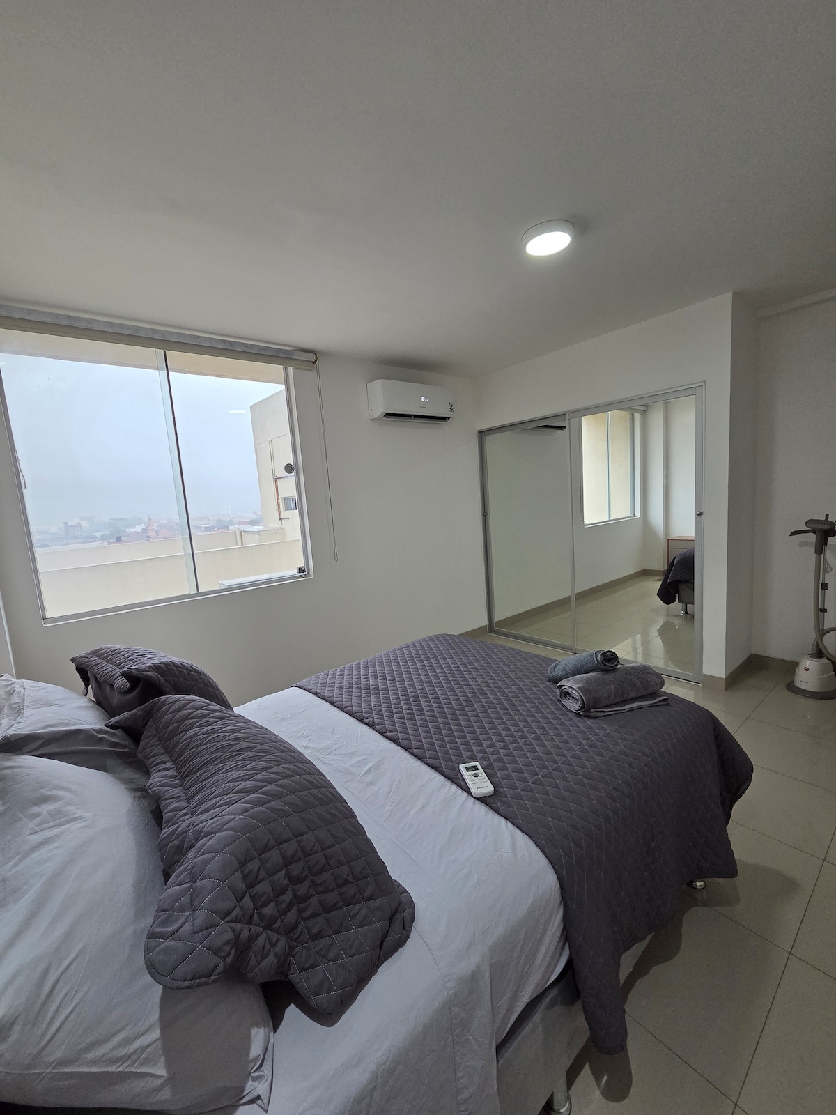 Departamento Monoambiente acogedor en Equipetrol, con todas la comodidades necesarias para pasar una buena estadía (Cama 2 ½ plaza, amplio ropero, tv 49” curvo con Netfilx, WiFi, Sofa Cama, escritorio, cocina equipada, aire acondicionado, baño equipado, balcón con espectacular vista de la ciudad). Áreas Sociales: piscina, área de CoWork, churrasqueras, lavandería, área de recreación.