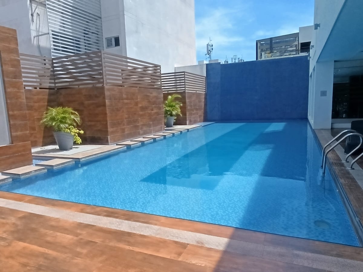 Vive tu estadía al máximo en una de las mejores zonas de la ciudad, un espacio tranquilo a solo pasos de uno de los centros comerciales más modernos el Ventura Mall, a un minuto de supermercados, farmacias, restaurantes,etc. Av. Salvador/Calle G, Equipetrol. Contamos con: - Cama queen - Sofá cama - Lujoso baño - Comedor - Cocina equipada - WiFi - Smart TV - Escritorio - Aire acondicionado Podrán disfrutar de: - Piscina infinita - Churrasquera - Cowork con WiFi - Terraza - Laundry Lounge
