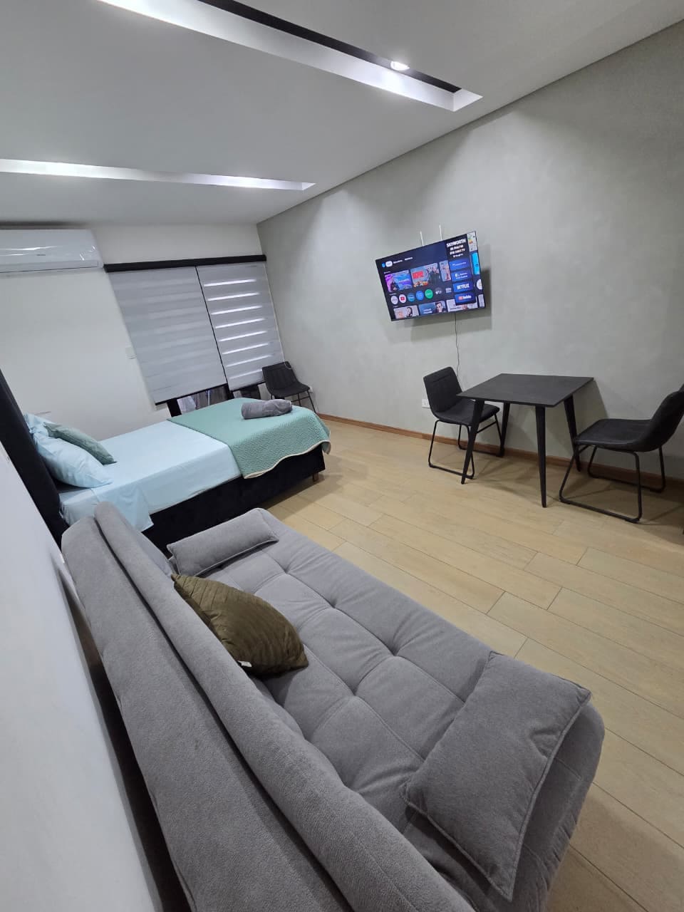 Live the experience of staying at Uptown Nuu, the most modern and comfortable building in Santa Cruz, located in Equipetrol, the city’s gastronomic and commercial hub. This smart apartment, fully automated with home automation technology (domotics). Ideal for executives and discerning tourists, is equipped with cutting-edge technology, featuring automated curtains, lighting control, climate control, and a smart TV, all operated through voice commands. Plus, our customized smart scenes.