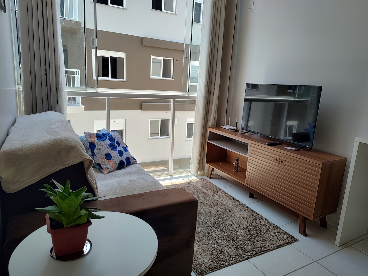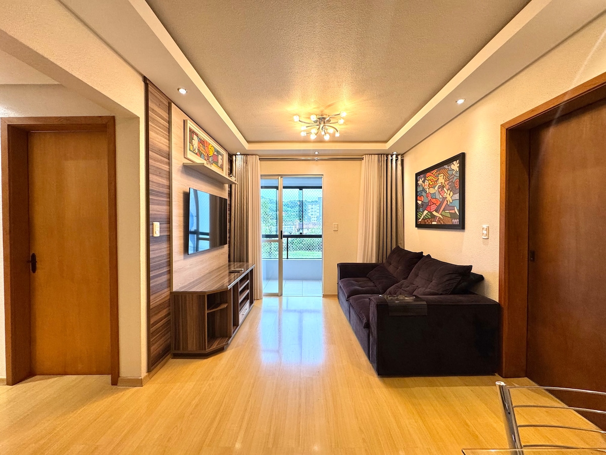 Apartamento bem localizado, equipado com ar condicionado, TV e cozinha planejada. garagem inclusa, ideal para executivos, casais com até dois filhos. Acomoda 4 pessoas. Sendo uma cama casal e um sofá cama. Possui WIFI - churrasqueira. Decorado para tornar o local aconchegante em sua estadia.