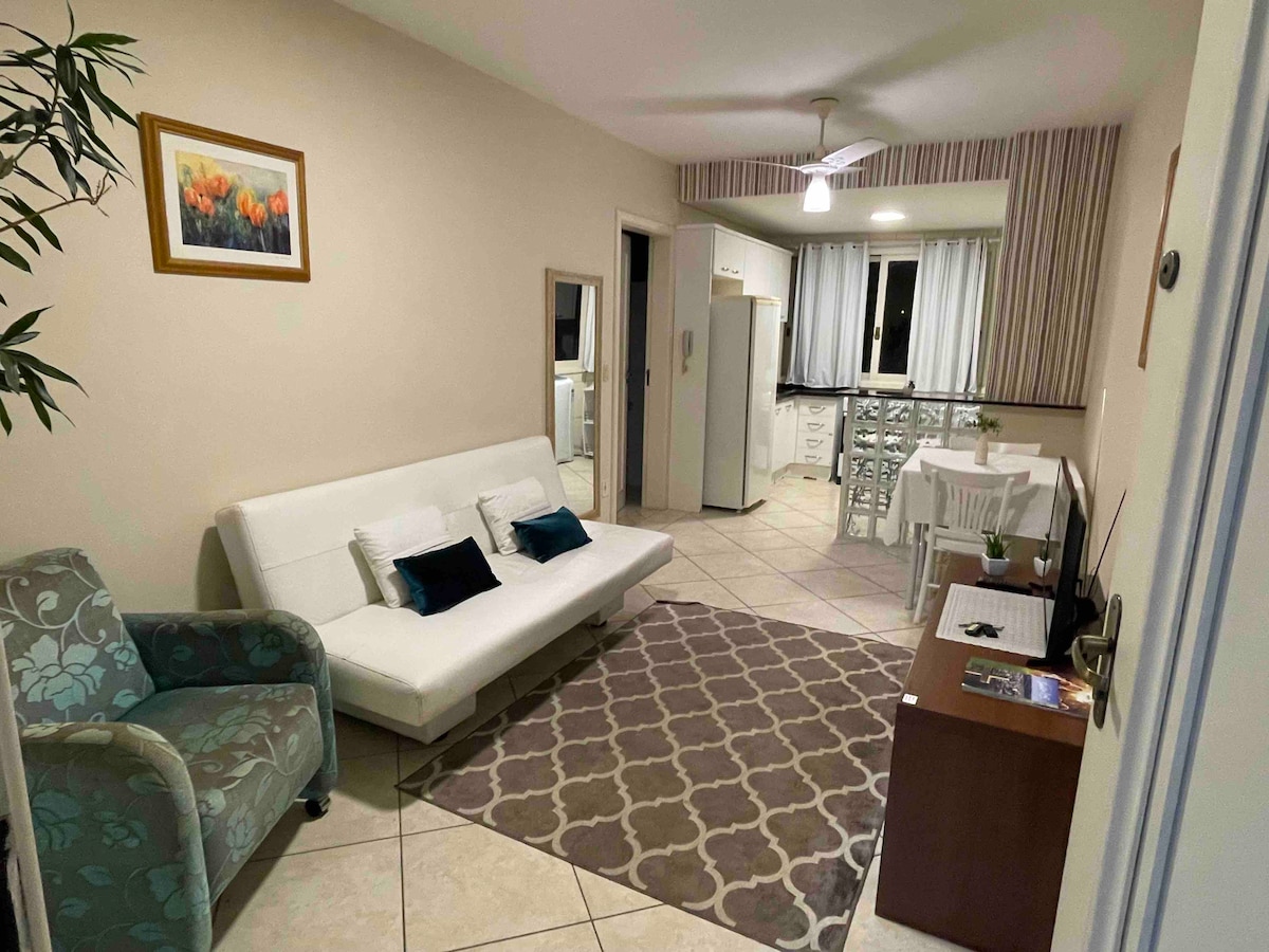 Apartamento bem localizado, equipado com ar condicionado, TV e cozinha planejada. garagem inclusa, ideal para executivos, casais com até dois filhos. Acomoda 4 pessoas. Sendo uma cama casal e um sofá cama. Possui WIFI - churrasqueira. Decorado para tornar o local aconchegante em sua estadia.