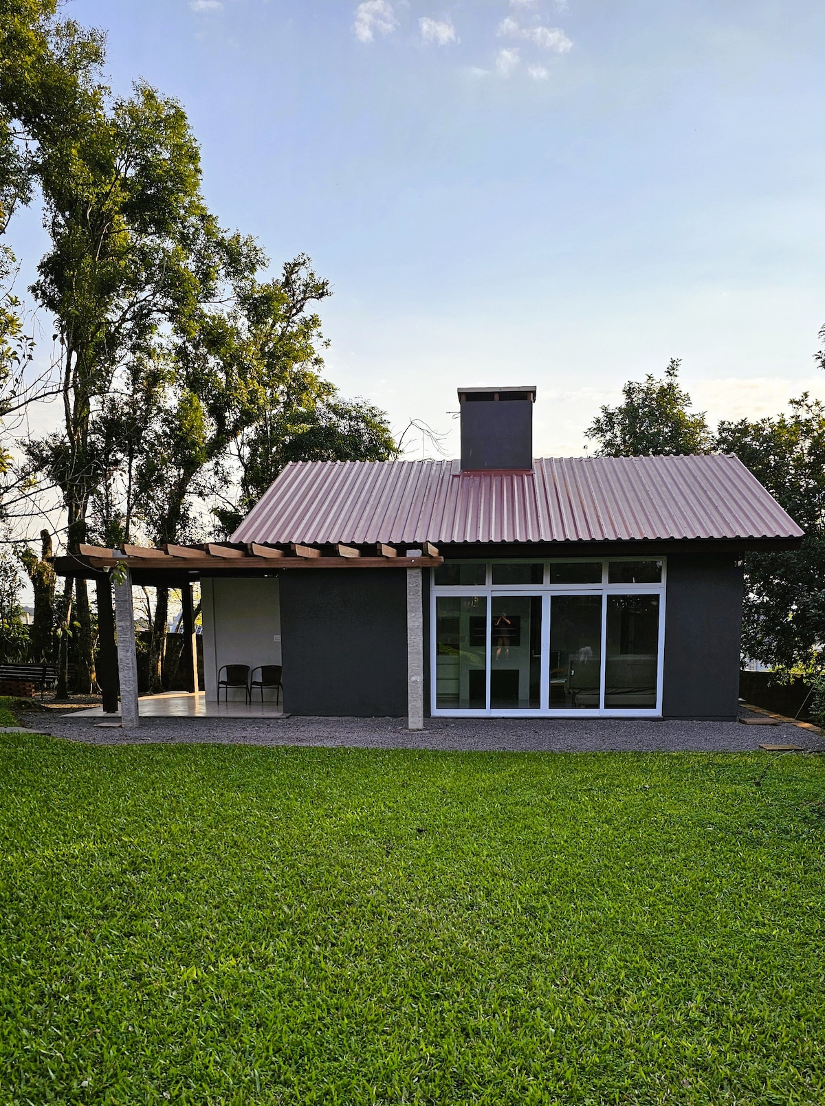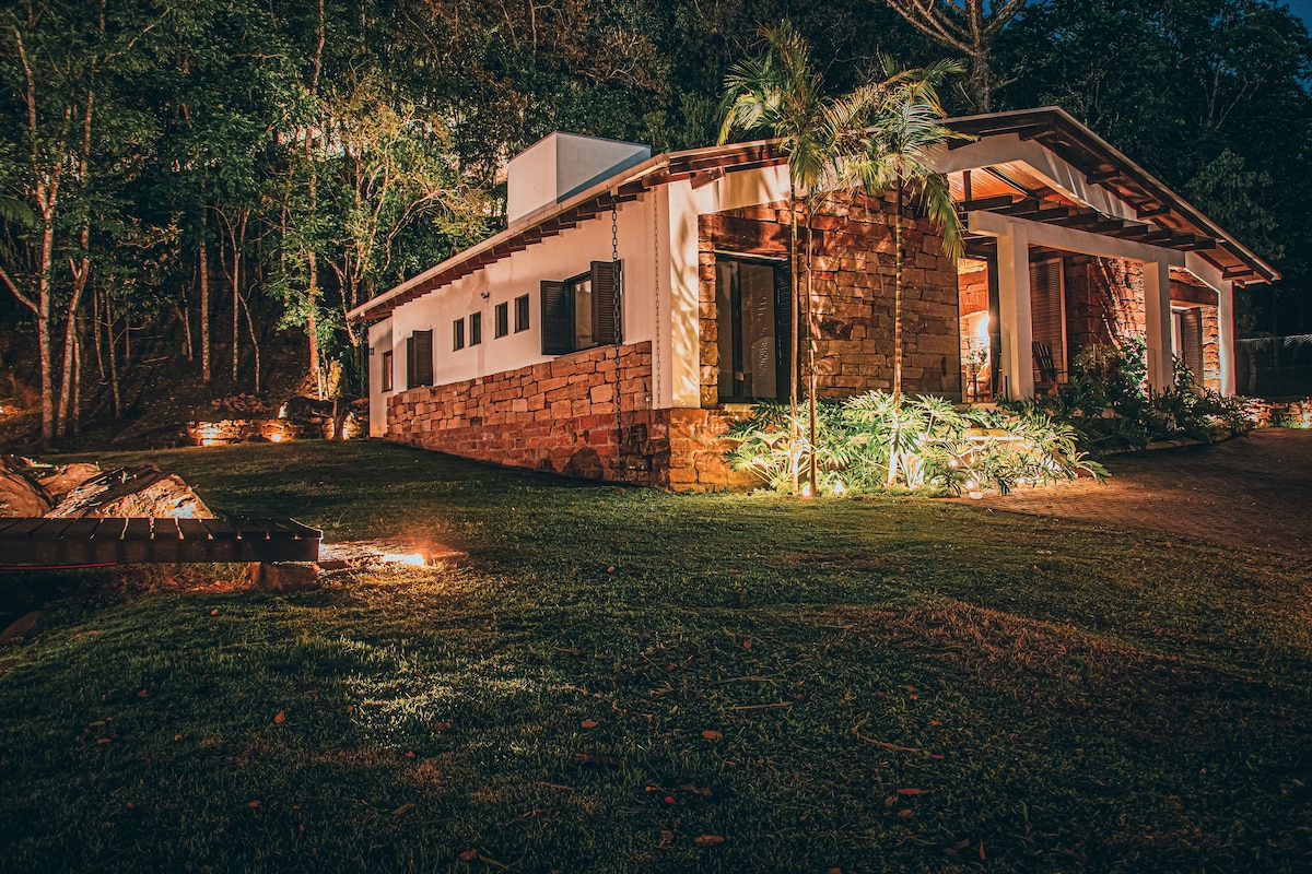 Casa em meio a um agradável bosque, com 1 quarto amplo e todos os ambientes climatizados. Oferece TV, Wi-Fi, Netflix etc. Cozinha com fogão, micro-ondas, torradeira, churrasqueira, fogão à lenha e geladeira; área de serviço com máquina de lavar roupas. Acesso independente da casa principal, em 5000 metros de área verde, lago, quadra de basquete etc. Colecionamos frutas, são 60 tipos que você poderá apreciar de acordo com a estação do ano. Comporta 6 pessoas em camas e até 8 em colchões extras.