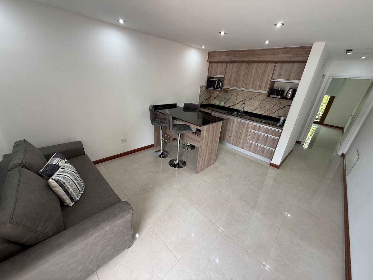 Apart 1 "Casa Coihue" está diseñado para quienes no se conforman con lo estándar y buscan una experiencia de confort premium en cada detalle. Desde que entras, la calidad de los materiales y el diseño de interiores te envuelven en una atmósfera de modernidad y relax. El gran protagonista es su cama King Size de 200 x 200 cm. La unidad está totalmente equipada con electrodomésticos de primera línea y utensilios de calidad. Para tus momentos de desconexión: Patio parquizado,Smart TV y WIFI.
