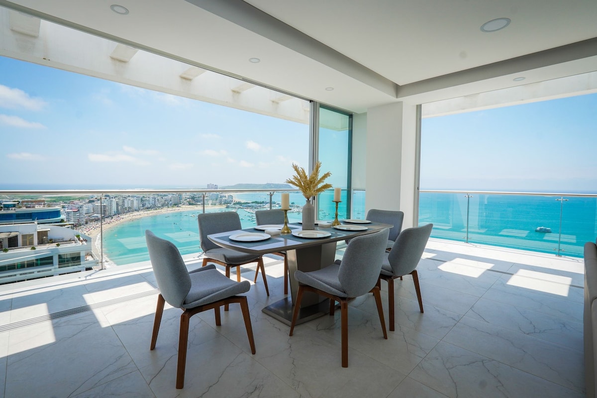 Vive una experiencia única en nuestro lujoso penthouse en el piso 24, con una vista panorámica inigualable al océano Pacífico. Relájate en una amplia terraza privada mientras disfrutas de los mejores atardeceres frente al malecón de Salinas. A solo pasos de la playa, restaurantes, bares y toda la vida costera que este destino tiene para ofrecer. Ideal para escapadas románticas, vacaciones en familia o simplemente desconectar con estilo y comodidad.