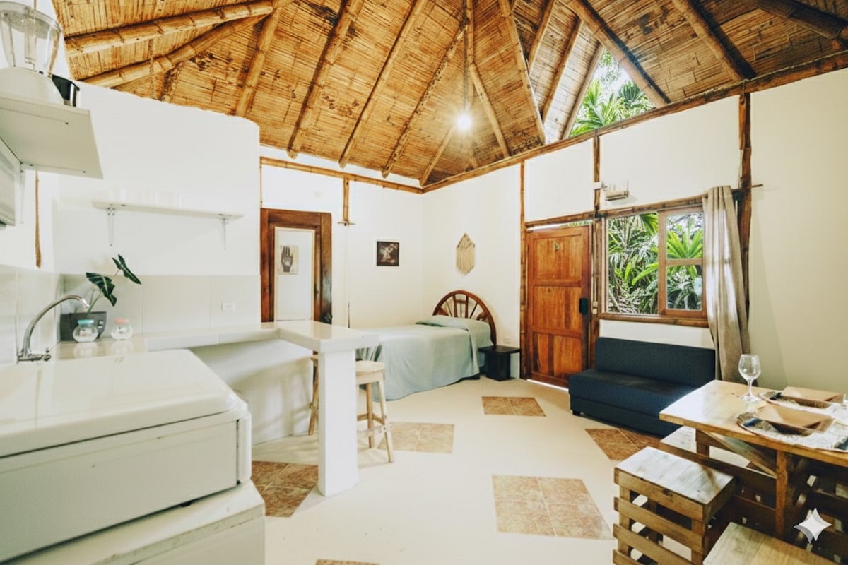 *Community Kitchen* Welcome to Lotus Cabins and Bungalows! This quaint bungalow has the best patio on the grounds and is right next to the beach. It's tucked right up to the mangrove forest for the feel that you are really in and a part of nature. The second level of this bungalow provides an intimate space to sleep and view the ocean, waves, and sunset. This space is great for those who don't mind staying in small spaces together or a family with small children.