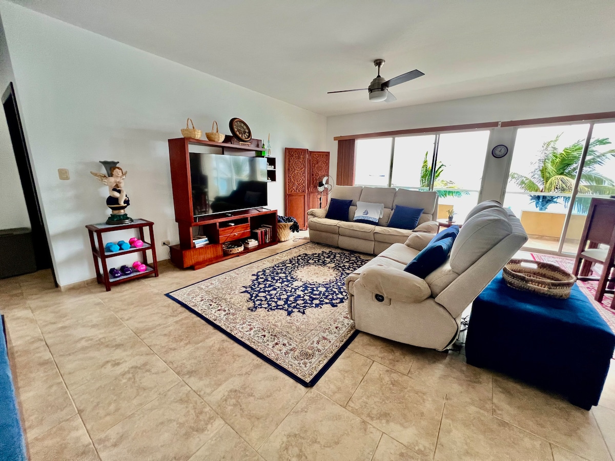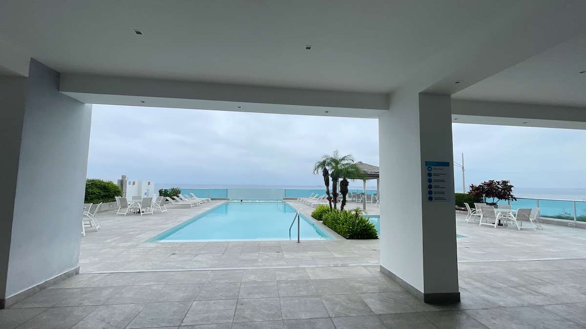 Apartamento ubicado en el Hotel Colon de Salinas. - Cuarto con Smart TV de 75 pulgadas y Netflix - 2 baños con ducha - Balcón con vista directa al mar - Sala - Cocina - Café y cafetera - Parqueo privado - Seguridad 24 horas - 3 piscinas - Justo al comienzo de El Malecón - Servicio de hotel (Restaurante, spa, gimnasio, room service). Estos servicios son independientes del apartamento. *Solo se permiten 2 huéspedes por noche* *Por favor tener cuidado con la hamaca*