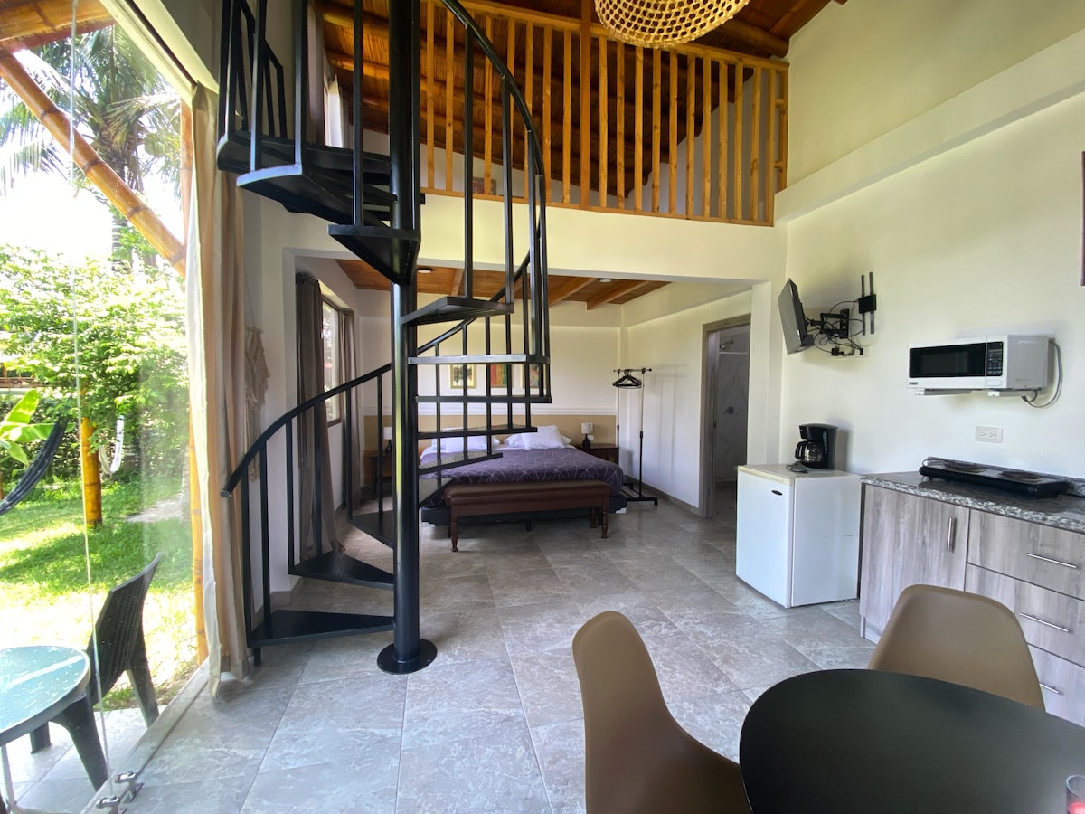 Conecta con la naturaleza en esta escapada inolvidable. Mini casa doble altura tipo loft sin divisiones, con mezzanine, en la planta baja se encuentra una cama de tres plazas, la cocina equipada, baño con calefón eléctrico, mesa comedor, Smart Tv con cable. Se conecta con el mezzanine con una hermosa Escalera en caracol. La parte superior cuenta con una cama de dos plazas y otra de una plaza y media. Aire split con capacidad para todo el loft y ducha exterior. Parqueo y guardianía las 24 horas.