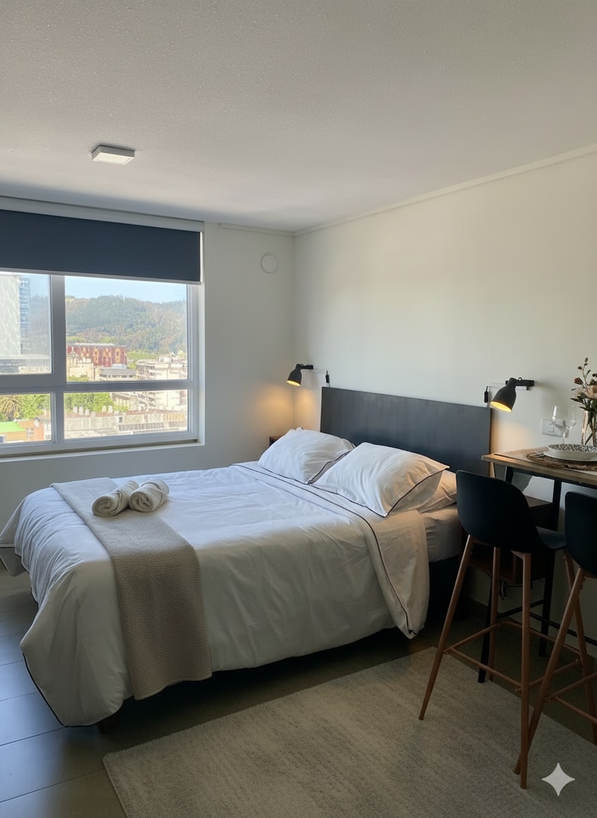 Disfruta de una estadía cómoda y moderna en este luminoso departamento full equipado, con una hermosa vista despejada a la ciudad. Ideal tanto para viajes de descanso como de trabajo. Ubicado a pasos del centro de Temuco, cuenta con wifi de alta velocidad (600 Mb), Smart TV con Netflix y HBO Max activos, y una cómoda cama premium que garantiza un descanso reparador. El edificio ofrece lavandería, conserjería 24/7 y estacionamiento privado gratuito.