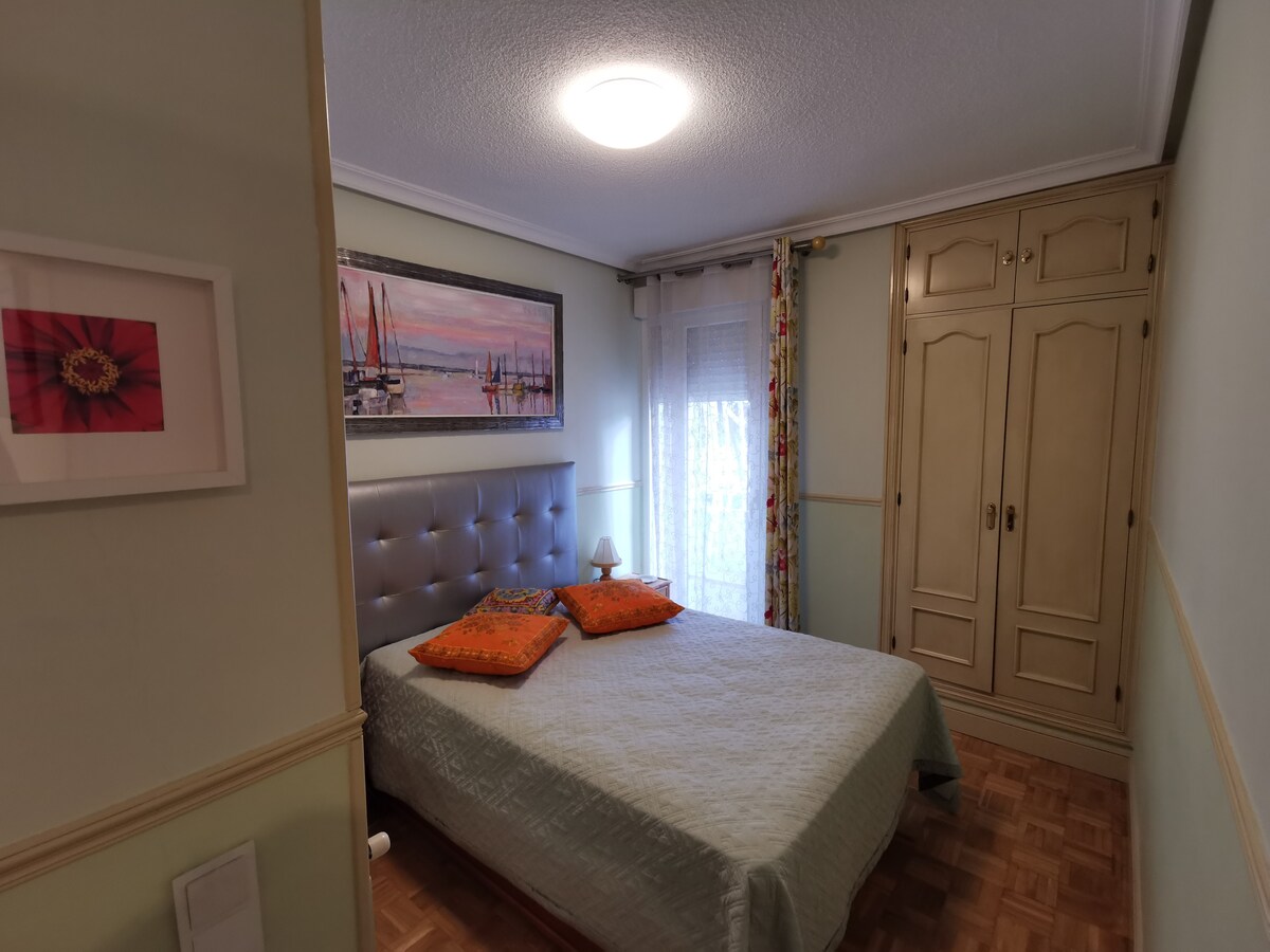 Cama grande ,escritorio, silla y aire acondicionado / calefacción .habitación espaciosa y muy soleada. Se oyen los pajaritos.Tardas 15 minutos al centro, 10 min al aeropuerto en taxi y 45 en transporte público . Es un 4 piso sin ascensor. Con desayuno de café, té tostadas,fruta y huevos.