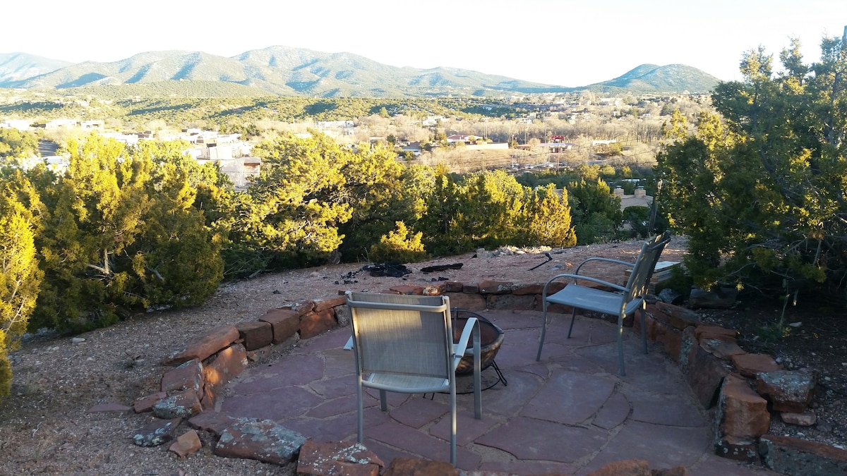 Large, sunny, self-contained studio with fabulous mountain views. Private entrance and private patio with goldfish pond. Fully equipped. Queen size bed, 3/4 bath, kitchenette and fireplace. Situated southwest of the city on 2.5 acres with 360 degree views. Great sky watching. Close to Santa Fe Ski Basin, Hyde Park and other outdoor sites. 7 miles from the Plaza and Canyon Road, 10 miles to the Santa Fe Opera, 60 miles from Albuquerque. Easy access to the 599 Bypass.