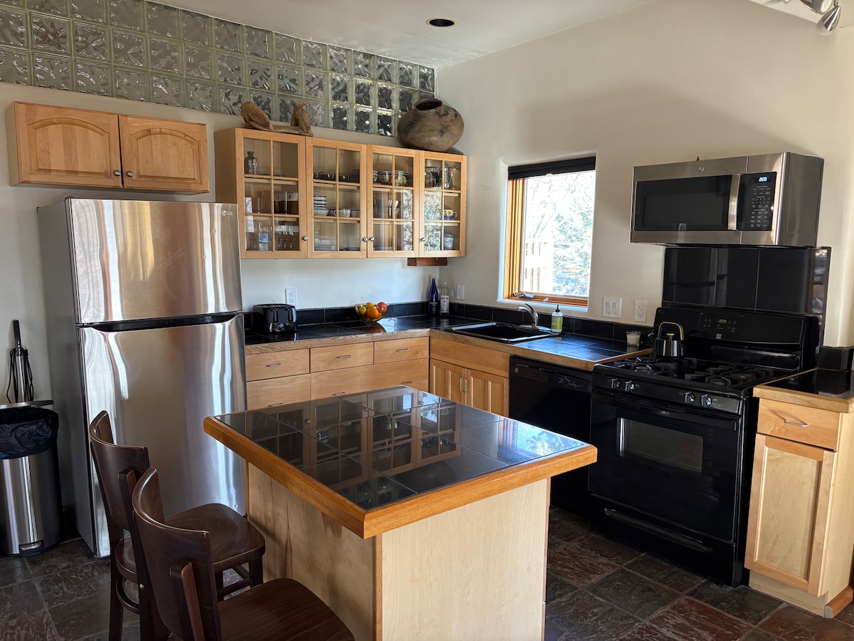 My place is 1.2mi from the plaza in a conveniently located residential neighborhood. With its small, simple, Santa Fe style, you'll feel at home right away! The main room has a kiva fireplace & sleeper sofa as well as a full kitchen & small dining area. There is a separate bedroom with a closet & washer/dryer. The enclosed, private courtyard is perfect for kids & pets. This guesthouse is separate from, but next to my home where I live with my partner, our son, and fuzzy dogs!