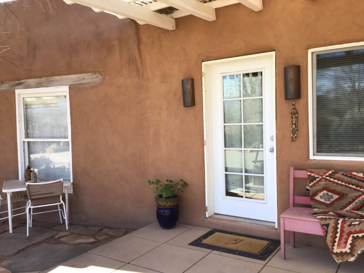 Full Breakfast with a Hot Entree, Private Entrance, High Speed Internet, Free Parking With door opening up to the Sangre de Cristo mountains, this room has a queen bed welcoming with 600 thread count Egyptian cotton sheets, private entrance, private bath, decorated southwestern-style for comfort and cheer. Southwestern tiles line the bath. An easy 10 minutes walk to the plaza (four blocks/half a mile), and a 5 minutes walk to the restaurant.