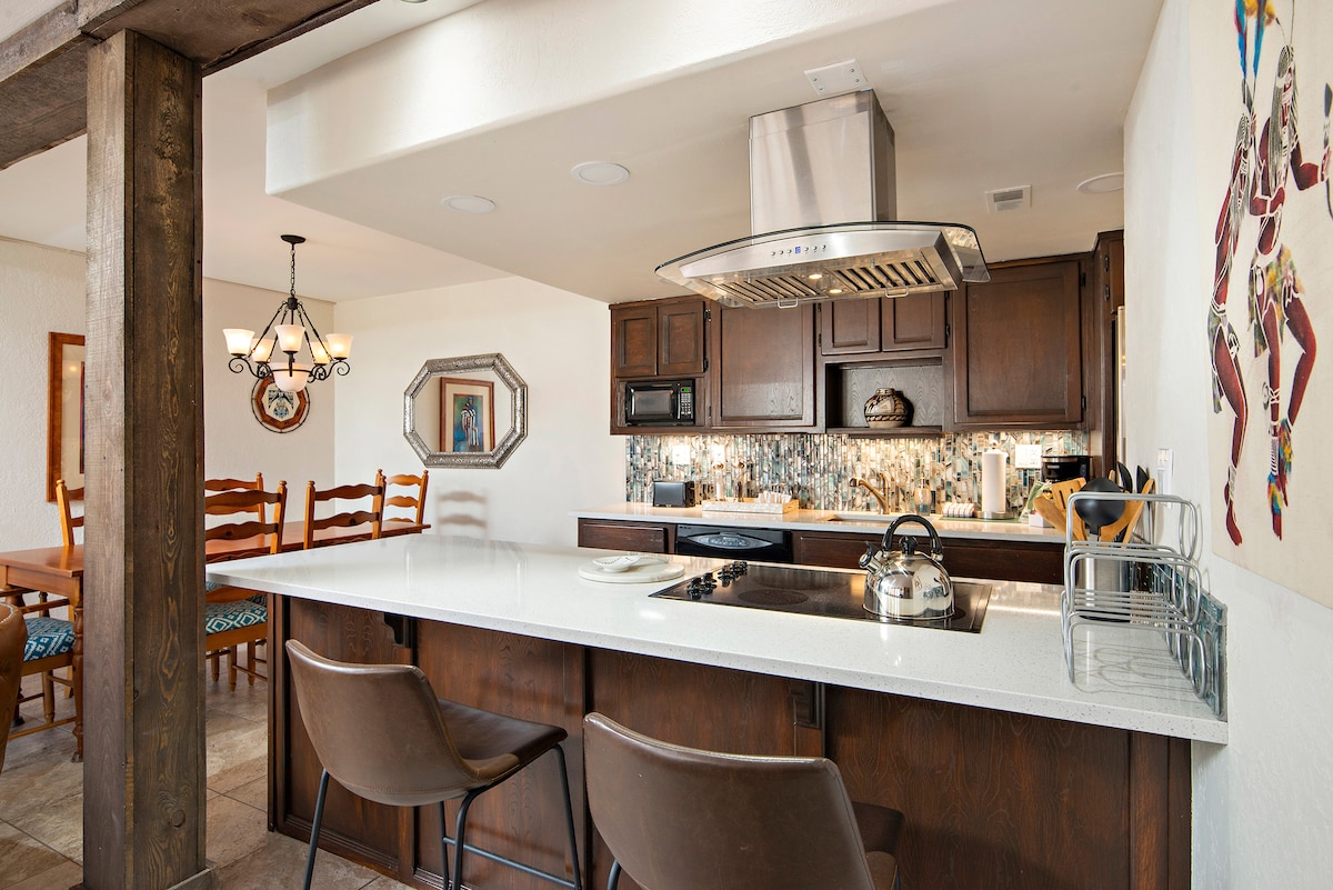 Gorgeous newly remodeled and well appointed condo with stunning mountain views from our covered veranda in Casa Solana neighborhood, just north of historic downtown. It is only 5 min drive to the Santa Fe Plaza, Railyard Arts District, downtown and Georgia O'Keeffe Museum. It is a true gem and has a cozy kiva fireplace with adobe banco seating, exposed beams, classy Pueblo and Spanish Colonial high-end touches. We are committed to making your stay delightful and unforgettable!