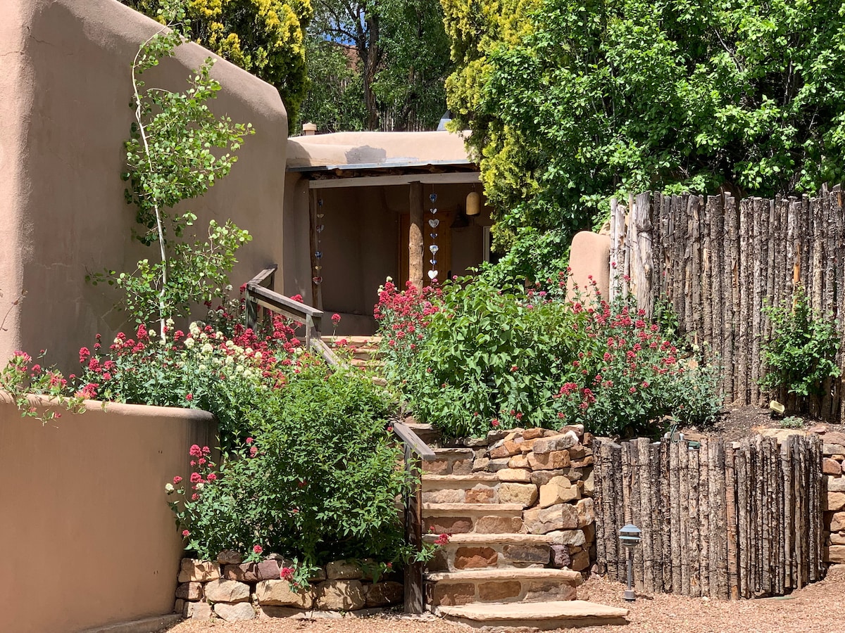 Soooo romantic! This nostalgic 1 BR/1 bath historic home is privately tucked away behind adobe walls on a quiet street just steps from downtown. Loaded with Santa Fe charm: viga ceilings, a seasonal kiva fireplace, full kitchen & beautiful private patio with a waterfall and koi pond. Walk to the Railyard, Plaza and gallery-filled Canyon Road. Pro-speed wifi and off-street parking keep your stay stress-free. Close to everything, while still quiet & private. Magic!