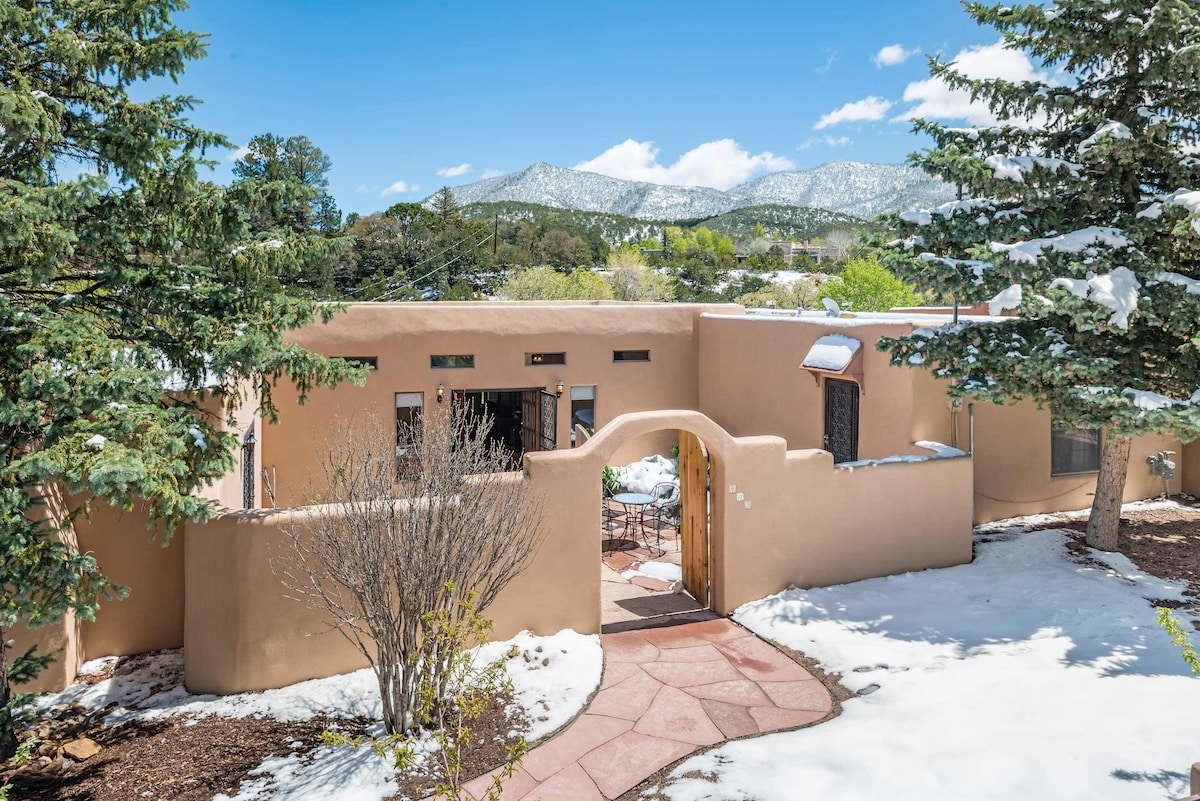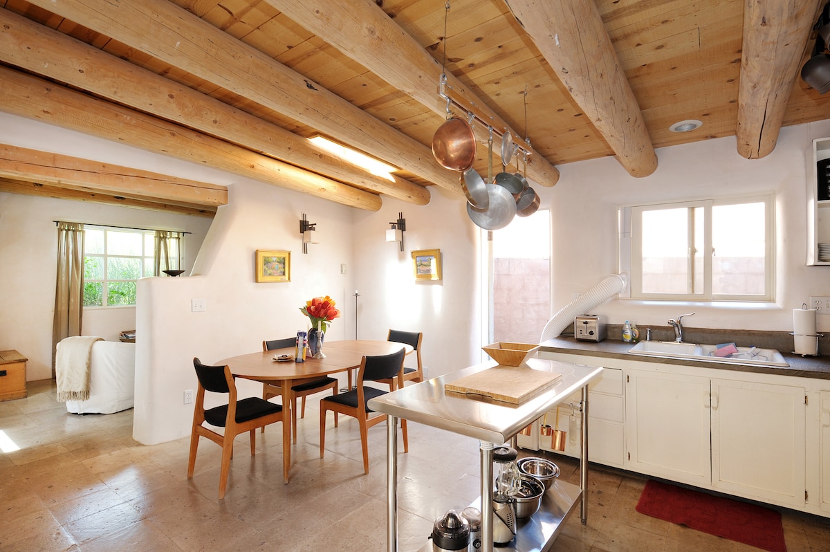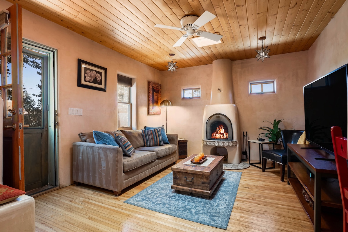 Our charming historic classic adobe casita is an easy ten minute walk to the Santa Fe Plaza, dining, and museums. We offer private off street parking for two vehicles. The interior features classic Santa Fe style wood beam Viga ceilings, kiva fireplace stocked with wood, skylights, a full kitchen living area, private bedroom, soaking tub, modern appliances, washer & dryer, swamp cooler, WIFI, flat-screen TV, a lovely enclosed courtyard with mature trees and BBQ. Dogs are welcome.