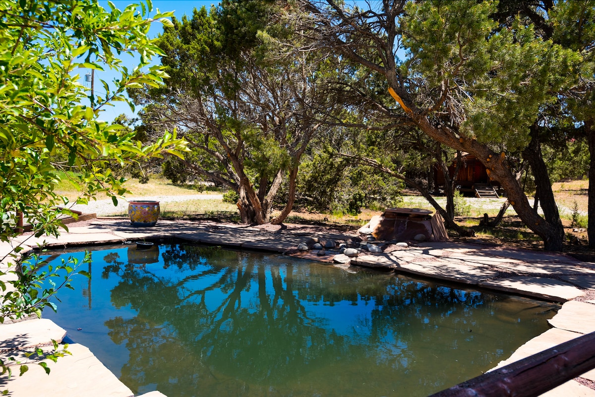 Stay where Gandalf & Frodo plan their next adventures. Explore the beautiful tile mural depicting an Ent's life (also known as Onodrim (Tree-host) by the Elves), take a seat in Gandalf's chair and command his staff, touch the amethyst crystal inlaid in the underground walls & enjoy the silence of being within the earth. The lovely Garden suite, a short walk across the courtyard, includes wifi, kitchen, and bath. Relax in another world & enjoy a break from reality! 15 min from Santa Fe plaza.